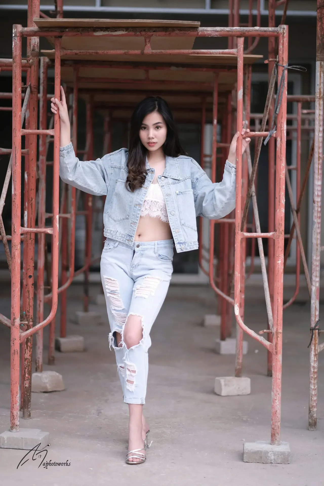 Urban elegance meets raw industrial charm in a fashion-forward portrait.