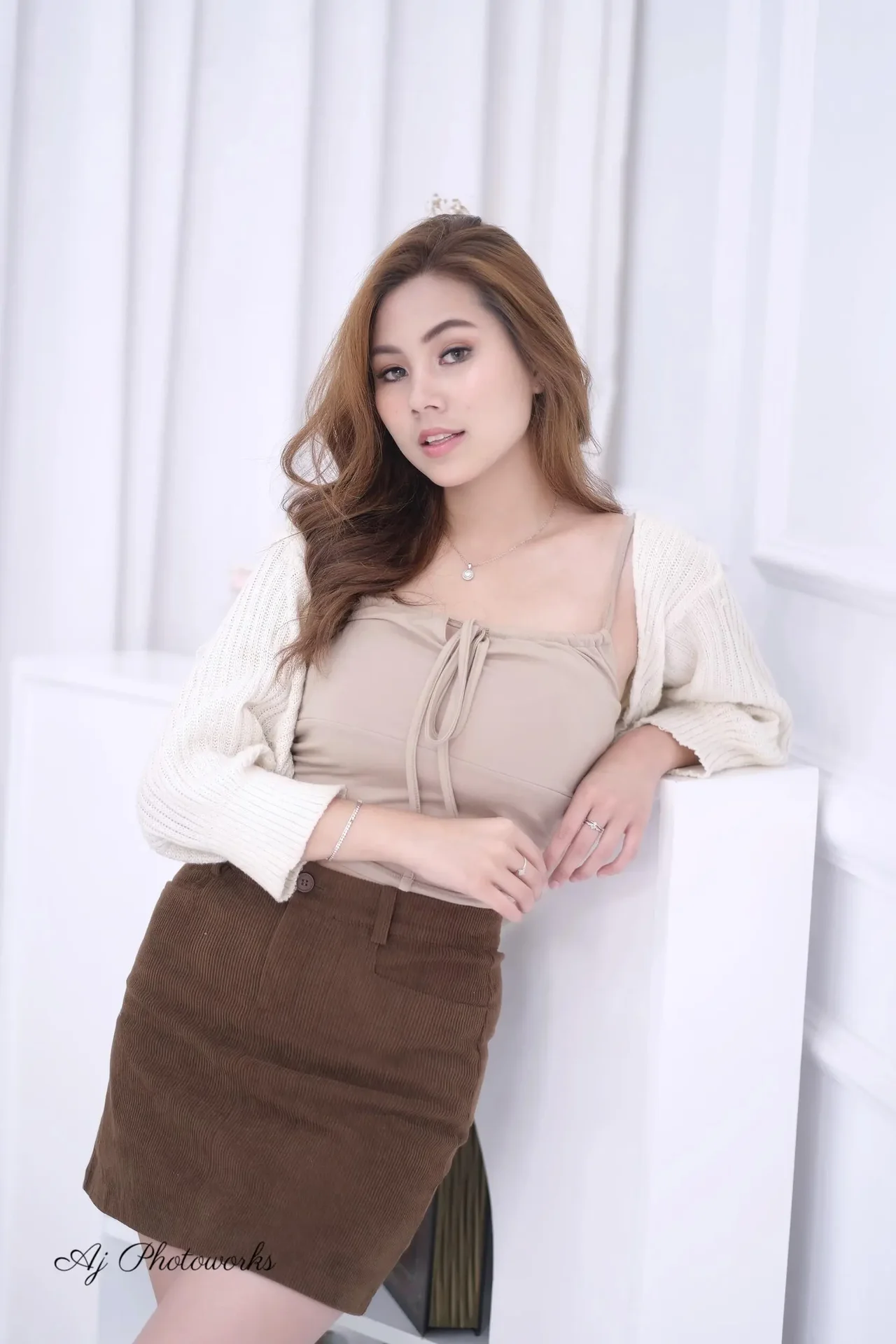 Casual chic meets modern elegance in a minimalist studio setting.