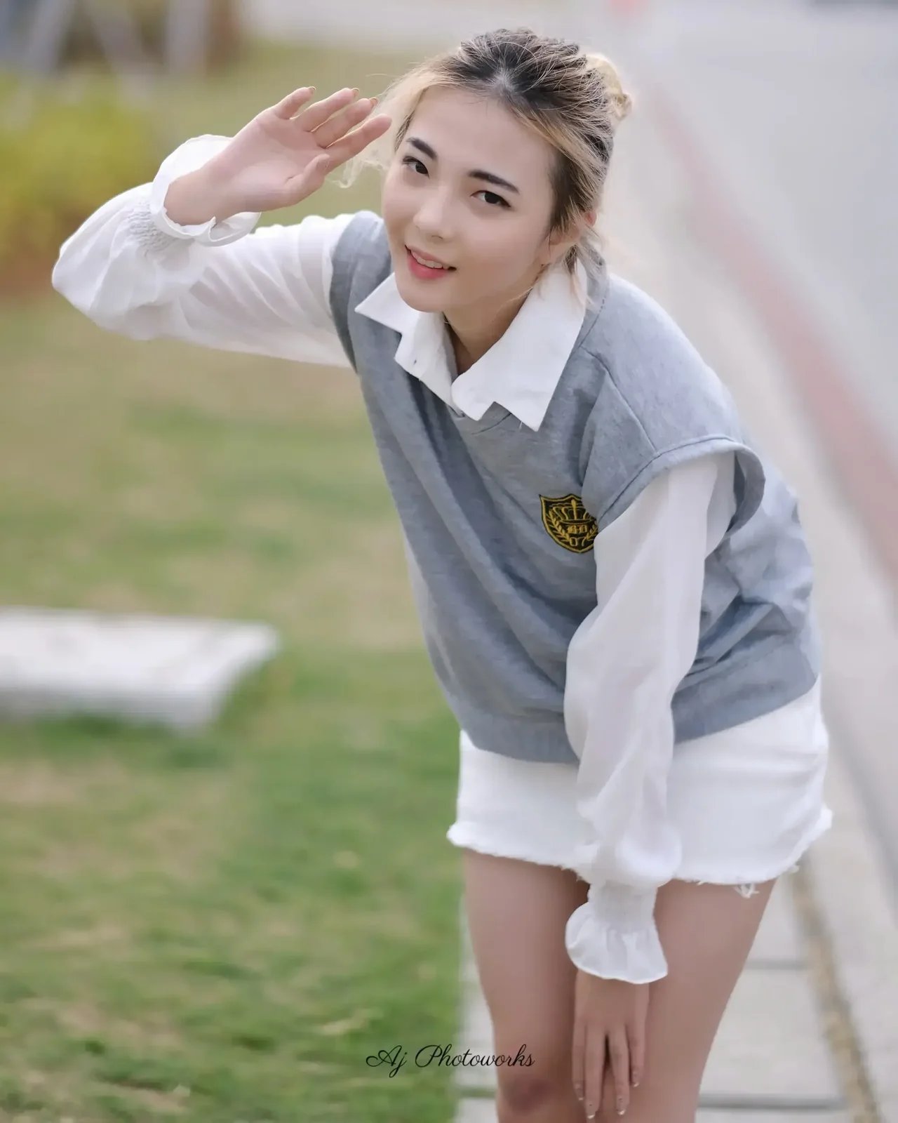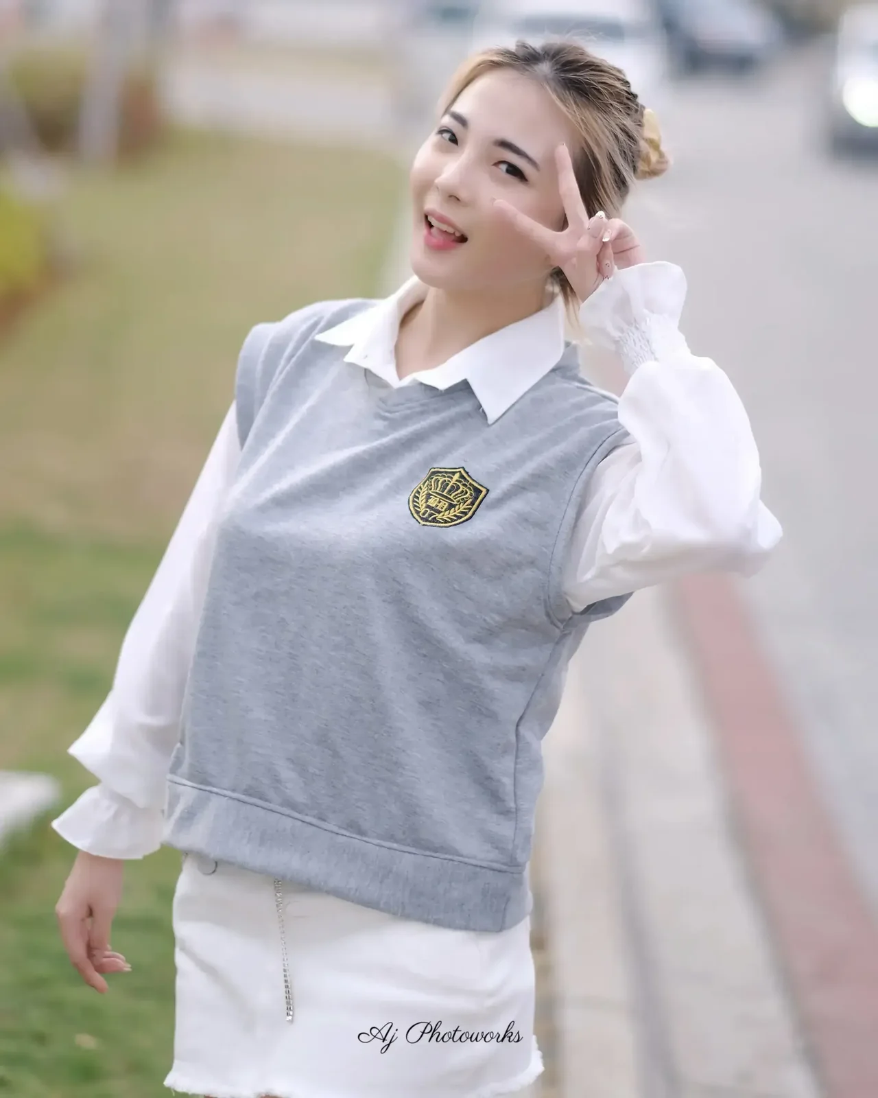 A stylish casual outfit featuring a crisp white blouse and a textured gray vest adorned with a crest, paired with a frayed mini skirt, captured outdoors in a sunlit urban setting.