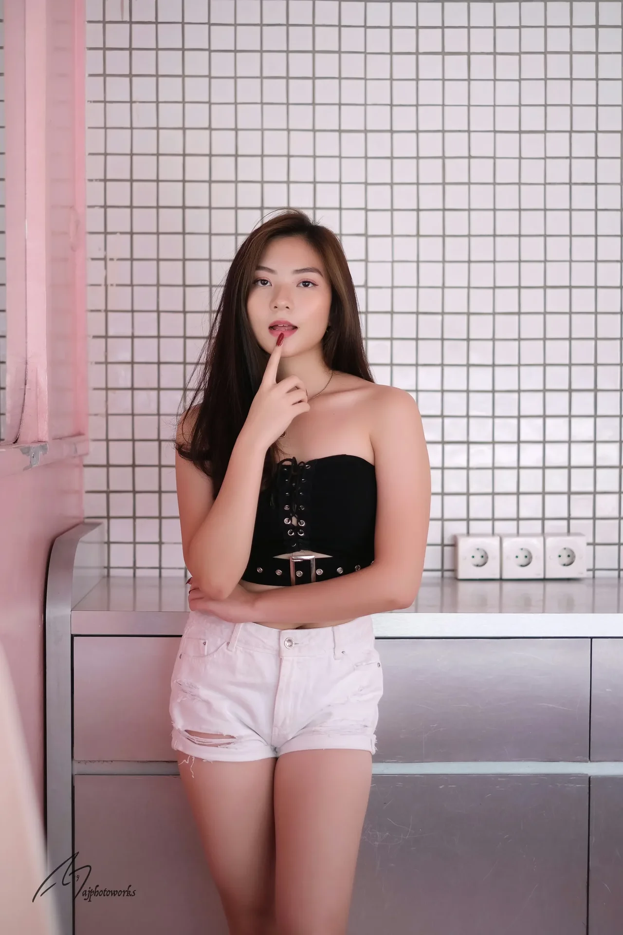 A striking contrast of black lace and white distressed denim against a geometric tiled backdrop, highlighting modern fashion aesthetics.