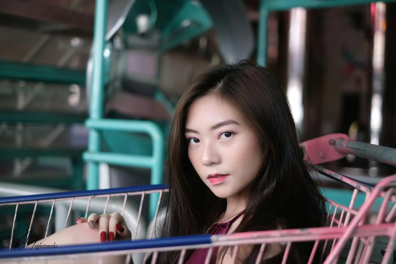A modern adult is seated in a pink light shopping cart, wrapped in casual elegance, within a vintage café setting adorned with industrial charm and playful retro vibes.