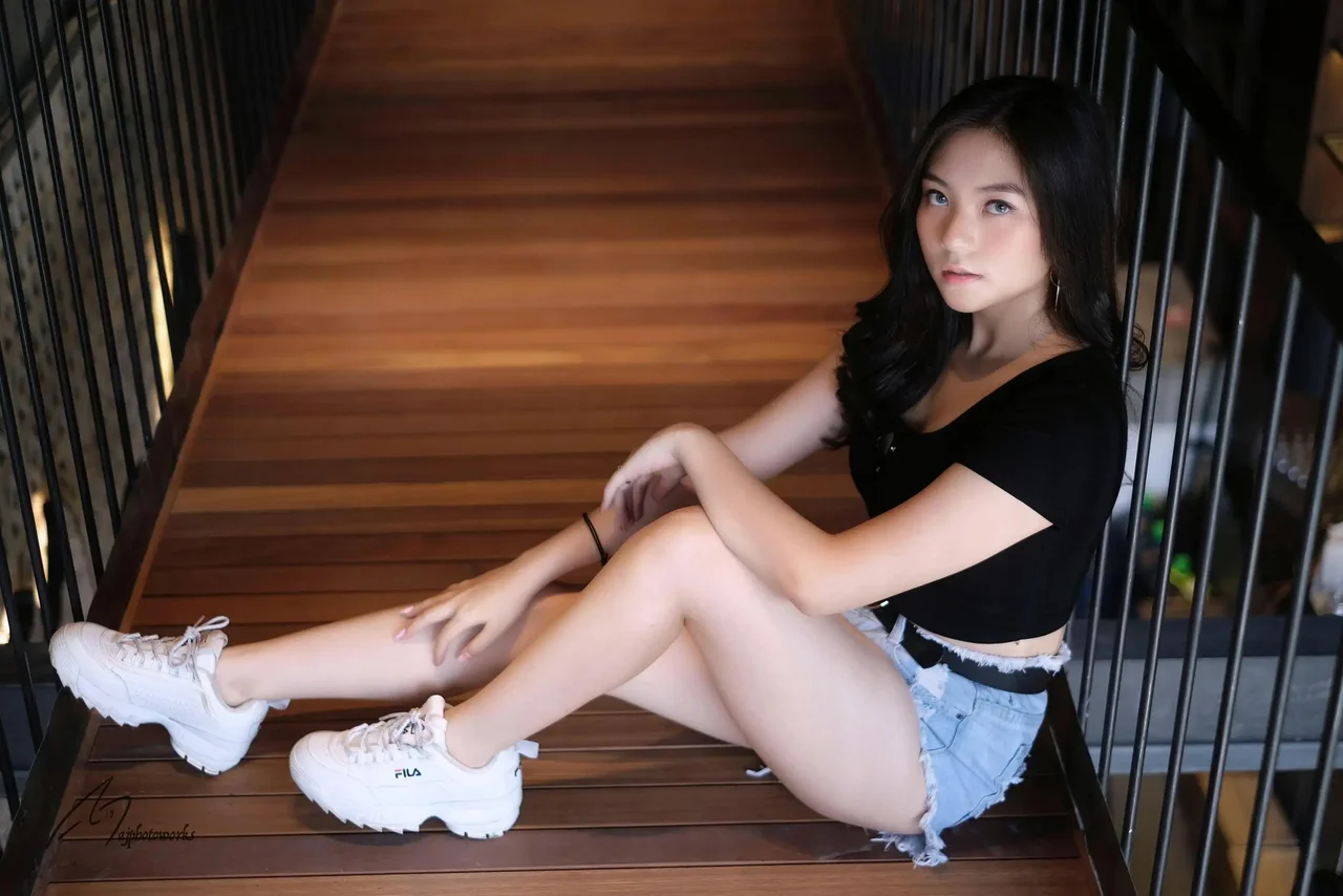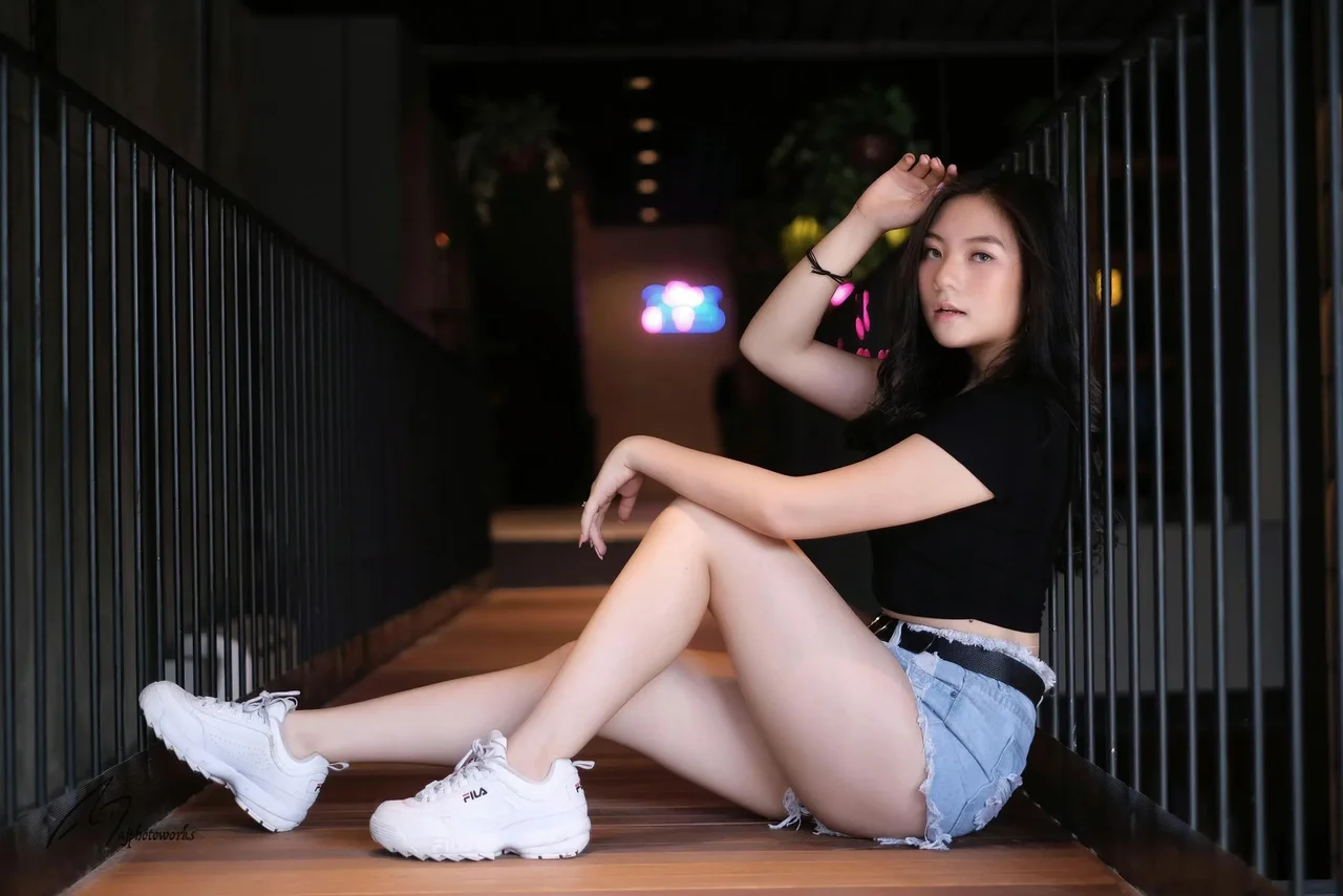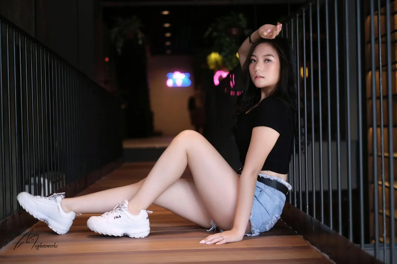 Stylish urban fashion meets vibrant nightlife ambiance: A confident young woman in a crop top and denim shorts strikes a dynamic pose on a wooden deck, surrounded by glowing neon signs and moody architectural textures.