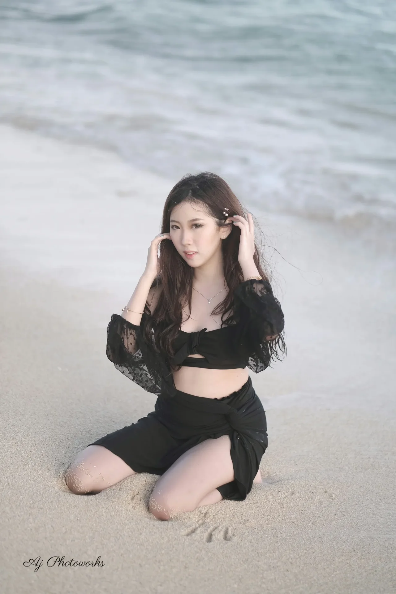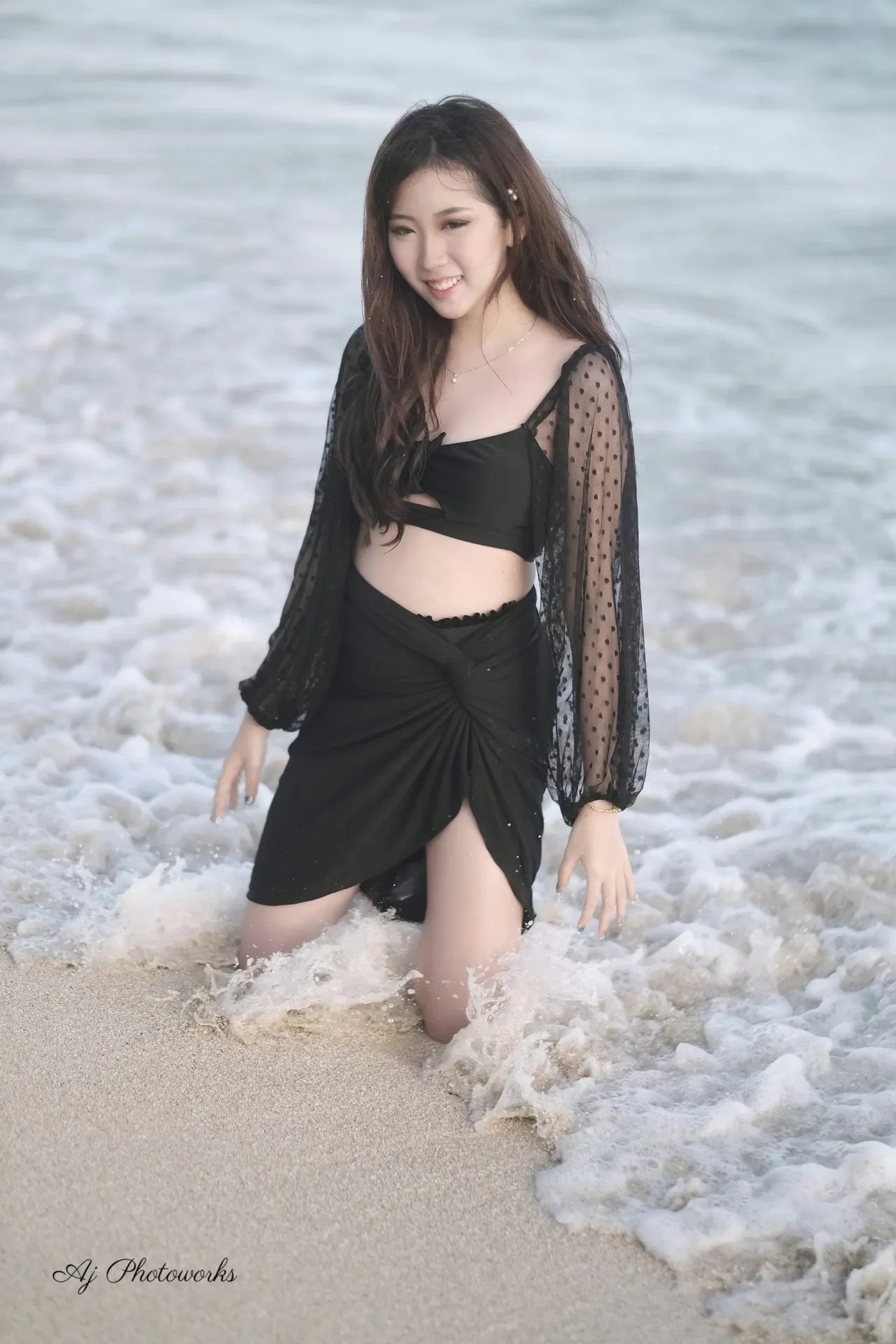 Elegant black beach portrait captures dynamic poses and cinematic waves in a serene coastal setting.