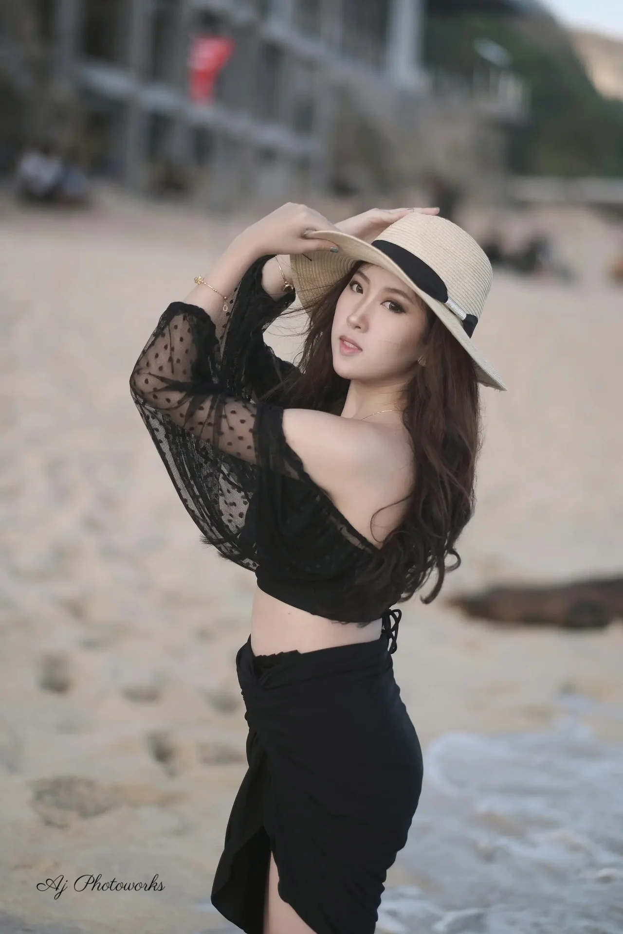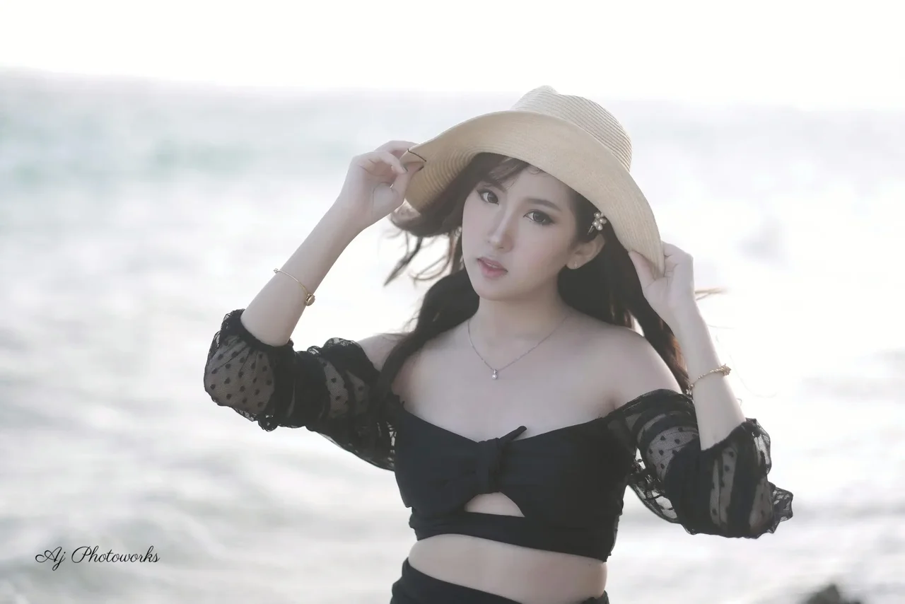A woman exudes coastal elegance in a chic black ensemble, golden hour light casting warm tones on sun-kissed sands and azure waves.