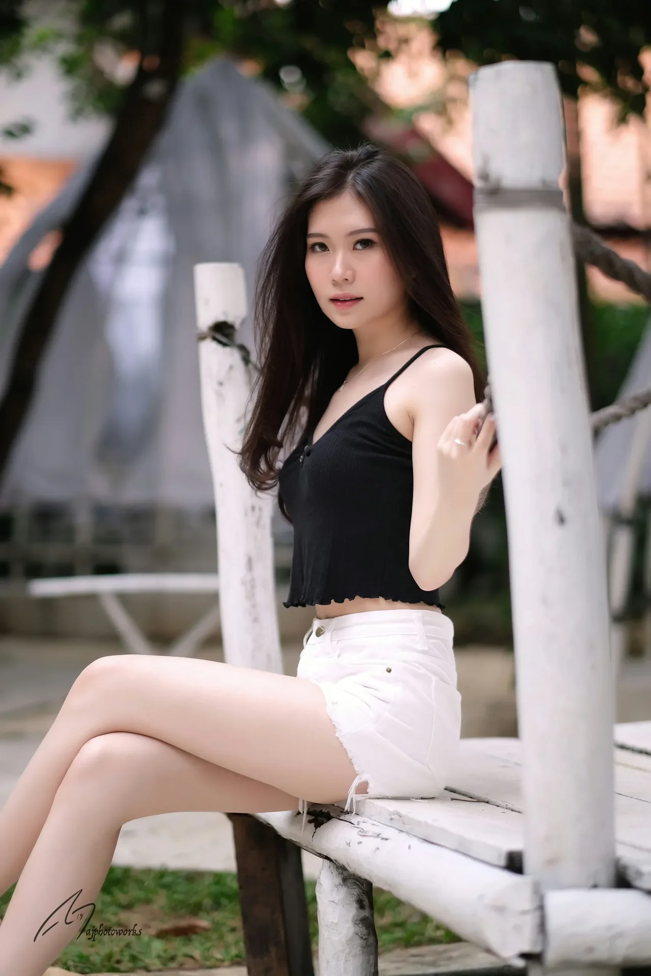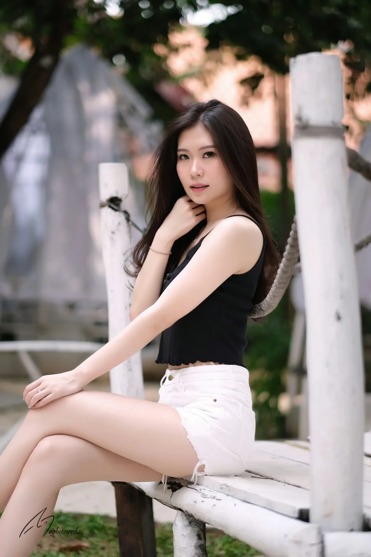 A serene portrait capturing a woman in casual summer attire amidst a tranquil garden setting, blending natural daylight with soft shadows to evoke a relaxed ambiance.