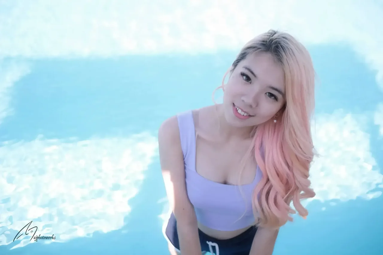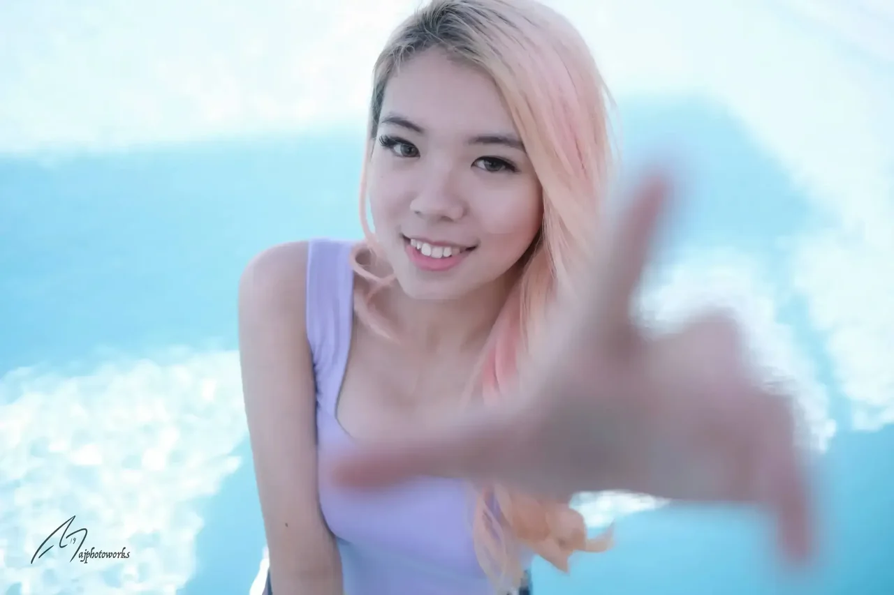 A vibrant portrait capturing youthful energy and color. The subject's playful pose and bright attire highlight a lively poolside scene under soft natural light.
