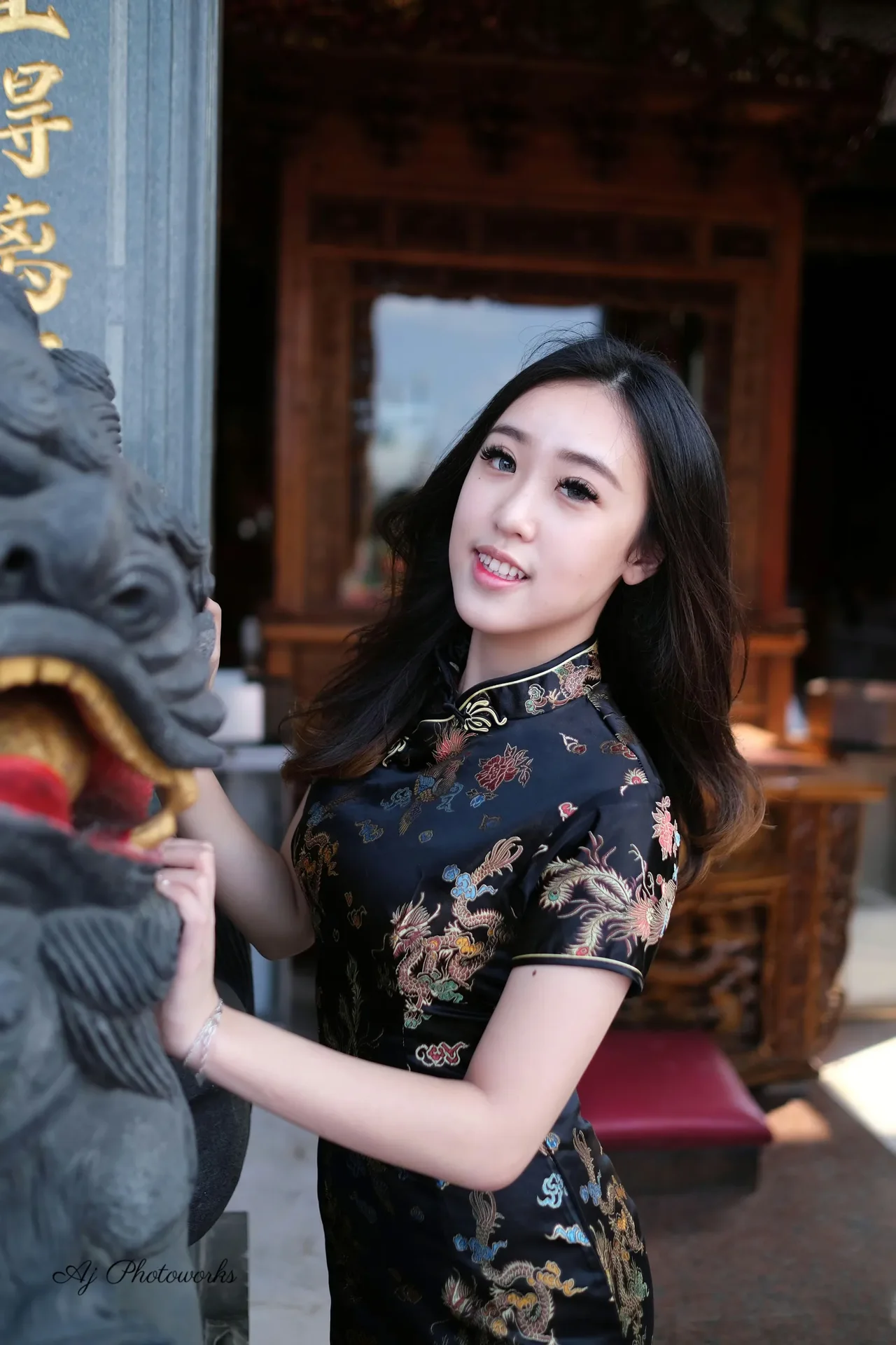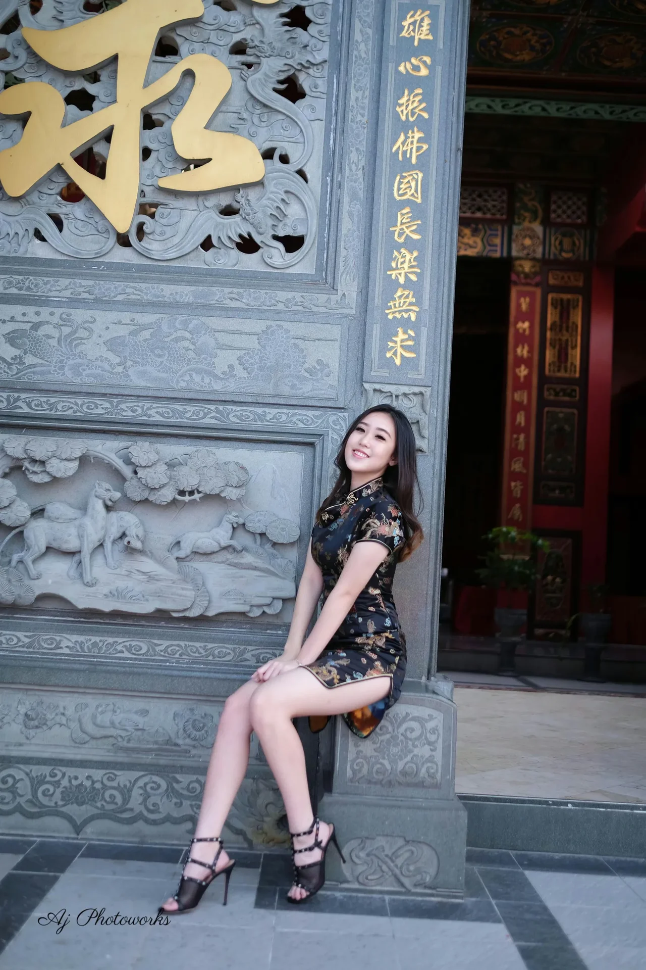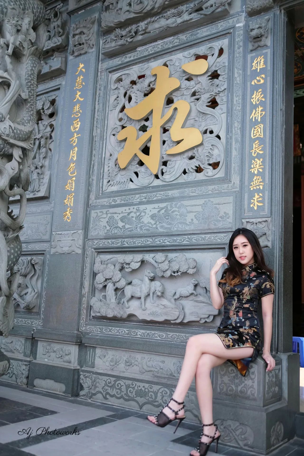 Elegance meets tradition in a cultural heritage setting, where intricate carvings and floral attire create a timeless portrait.