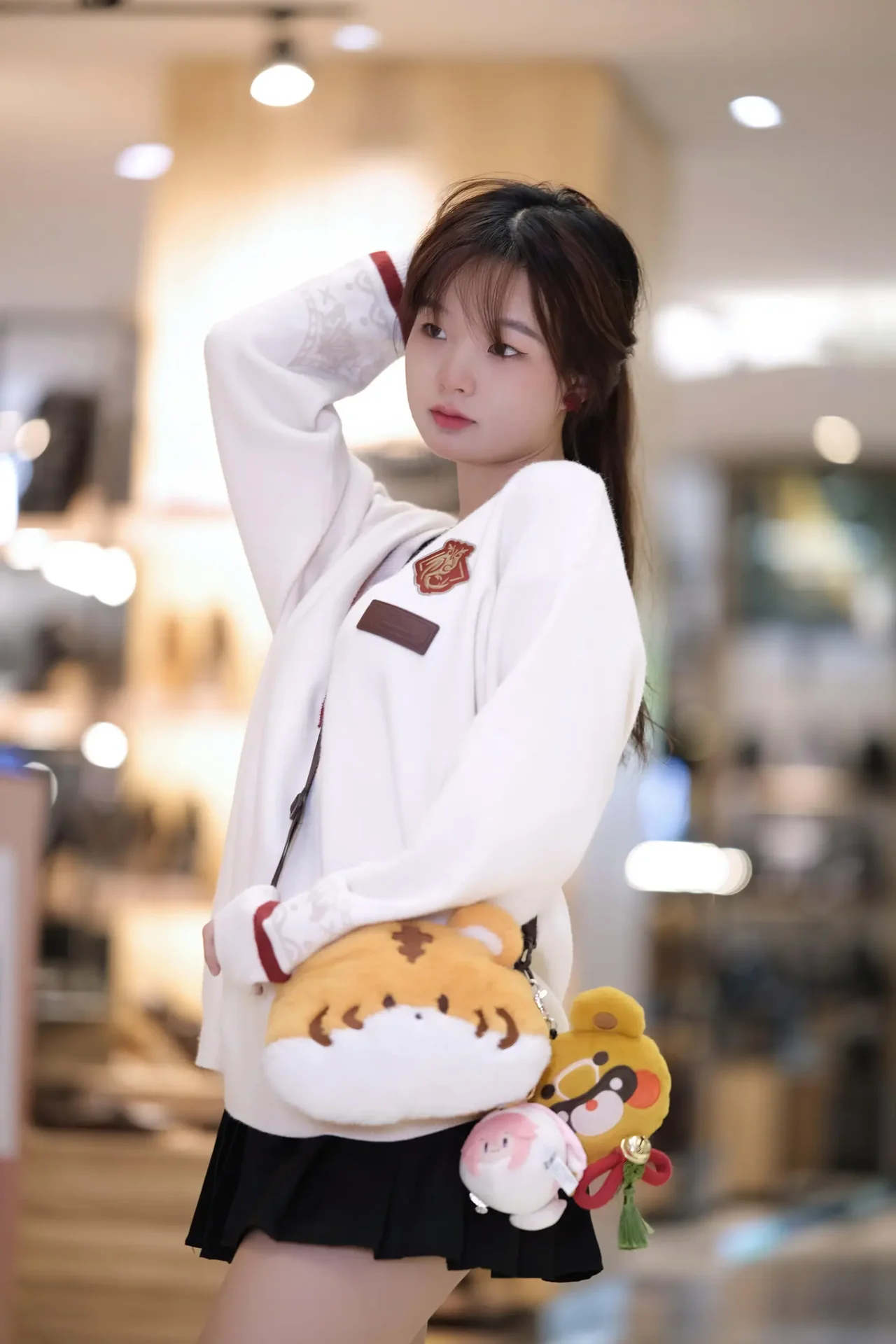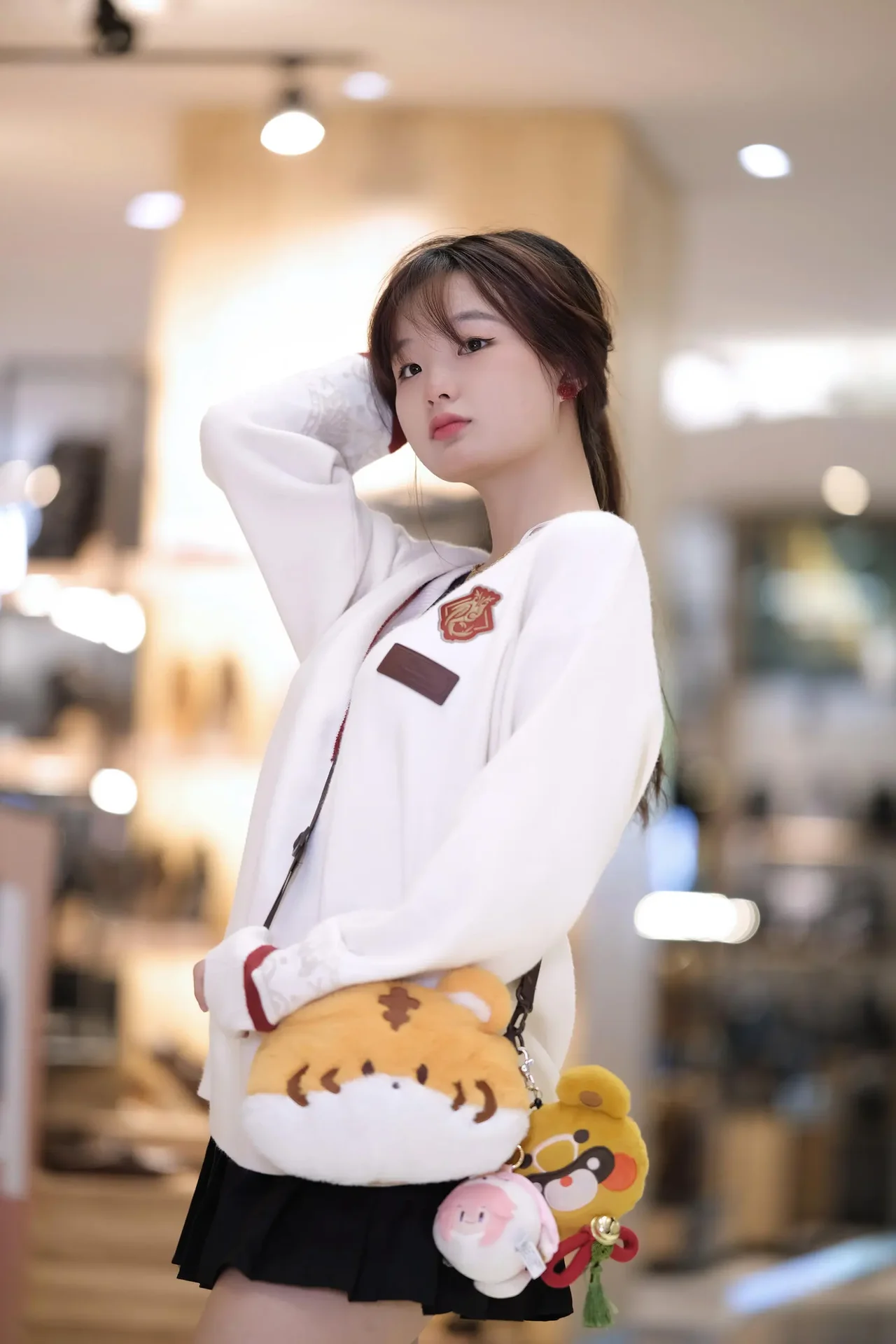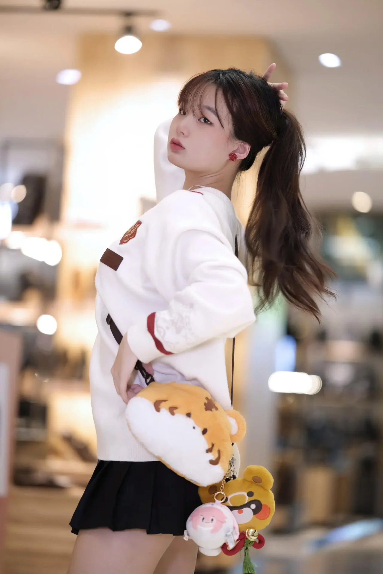 A stylish ensemble blending comfort and chic details, highlighted by playful accessories and a plush-favorite vibe.