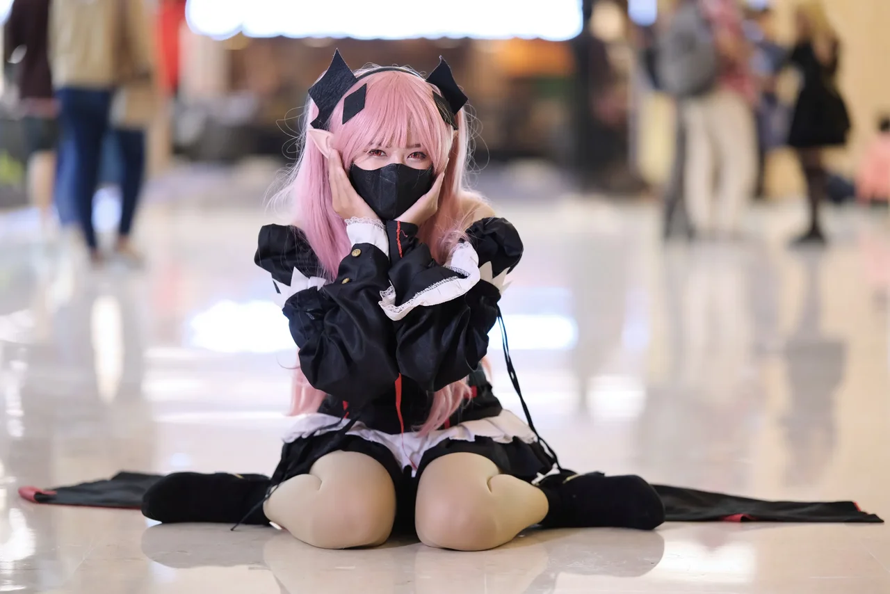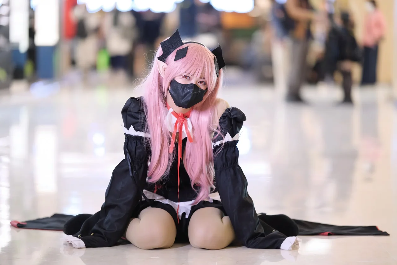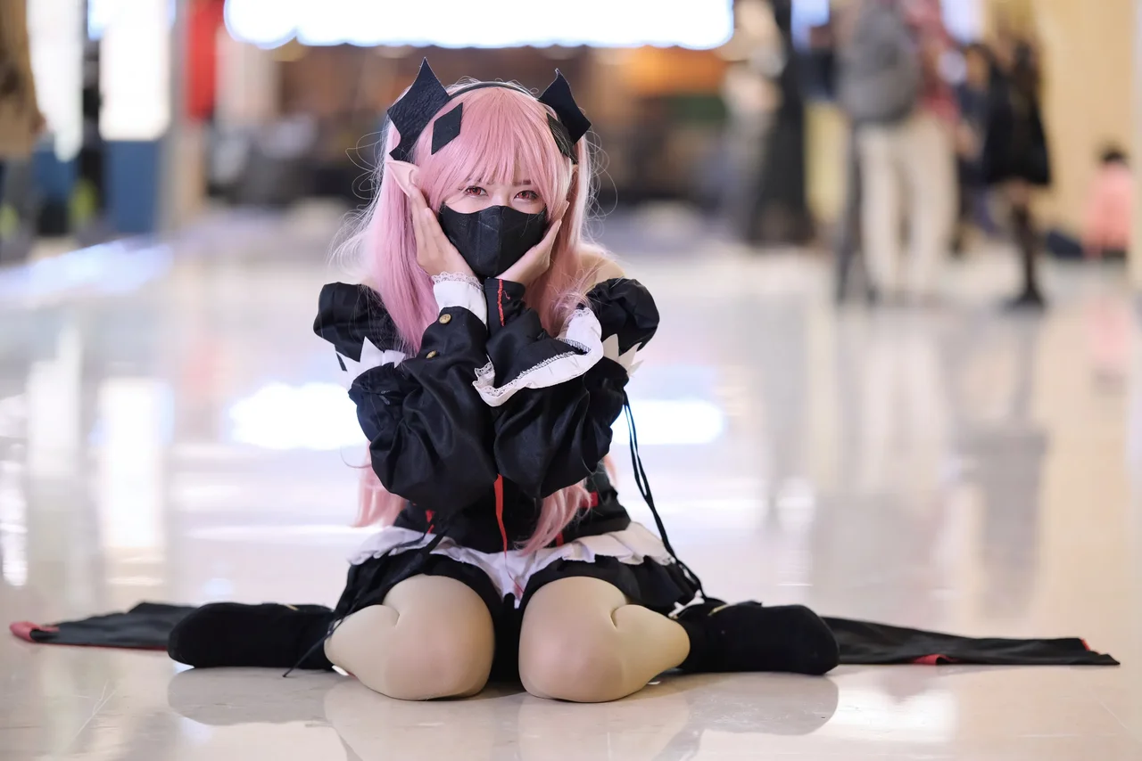 Vibrant pink hair and a gothic-inspired anime-inspired costume command attention in a dramatic indoor pose.