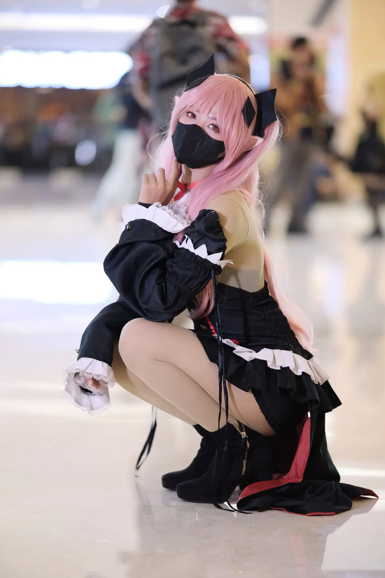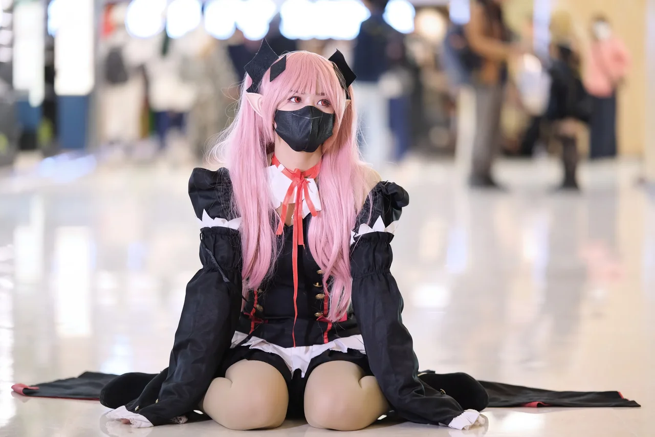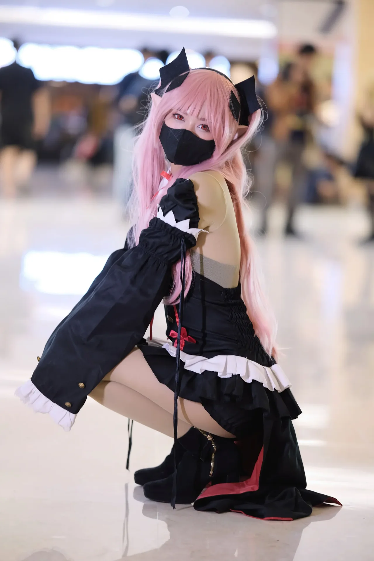 Vibrant pink hair and a gothic-inspired anime-inspired costume command attention in a dramatic indoor pose.