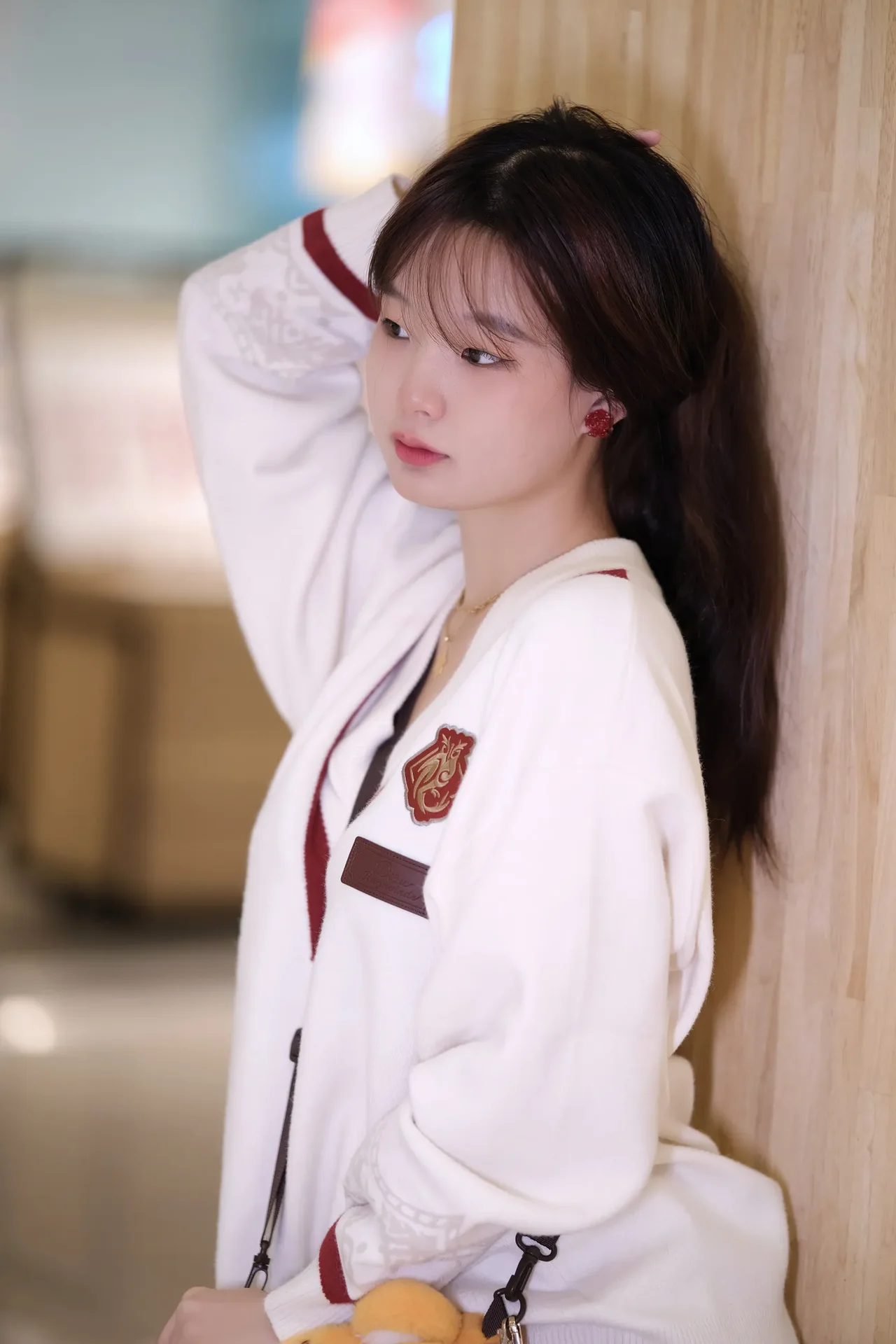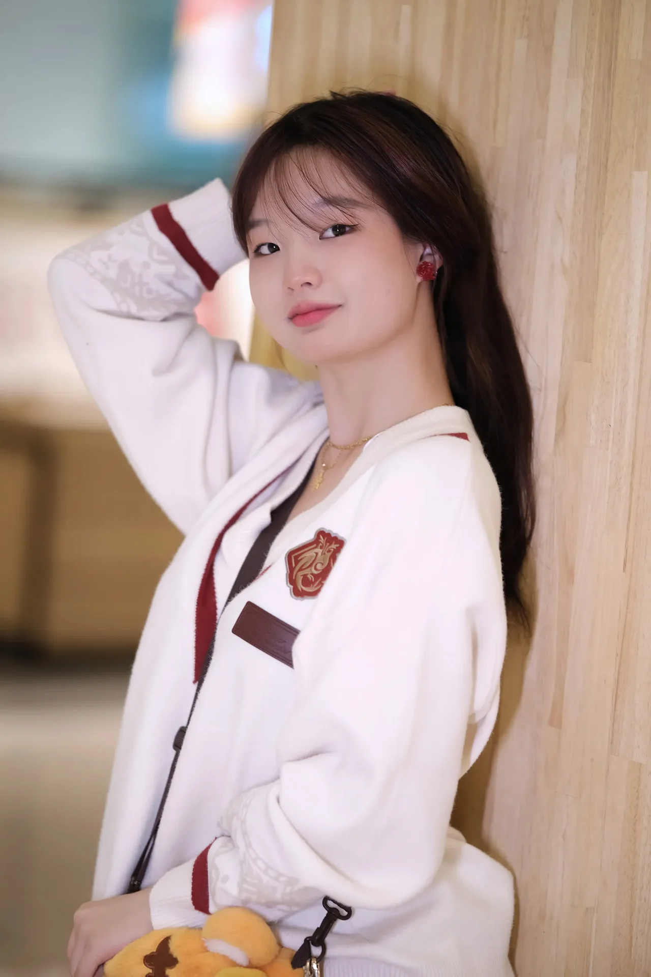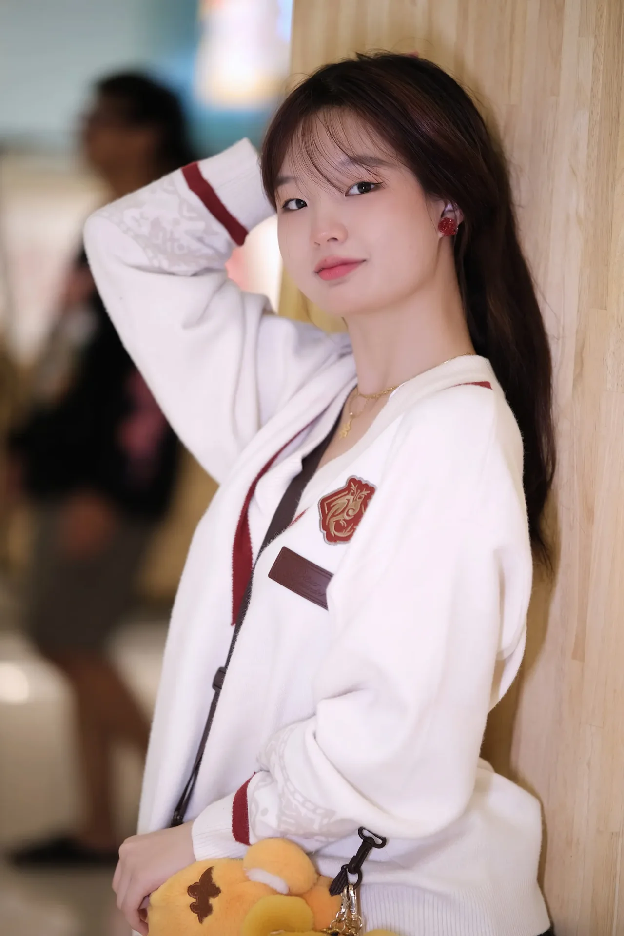 A young woman in a white and red hoodie with dragon emblem and leather patches poses against a wooden backdrop, blending casual elegance with subtle fantasy elements.