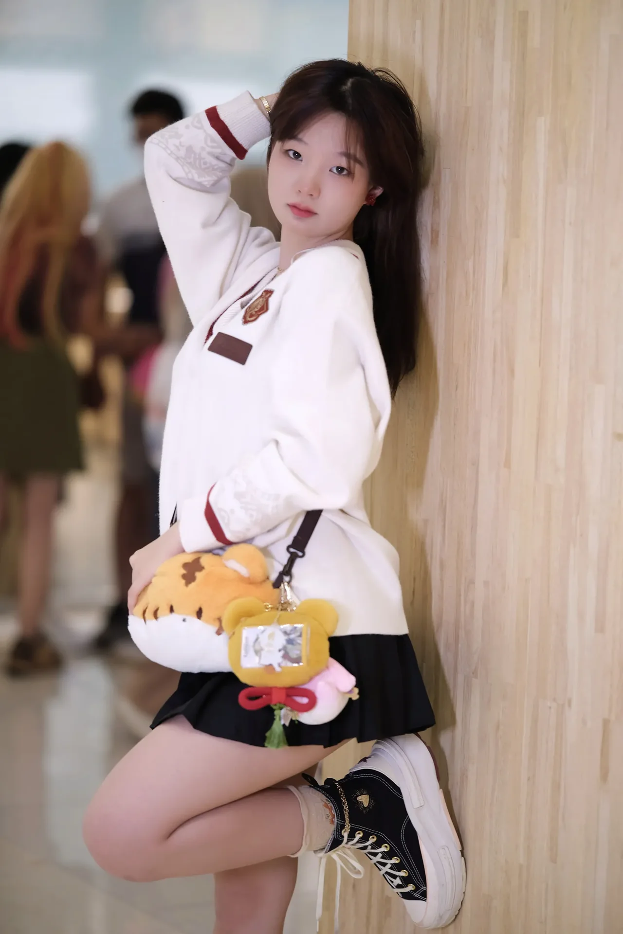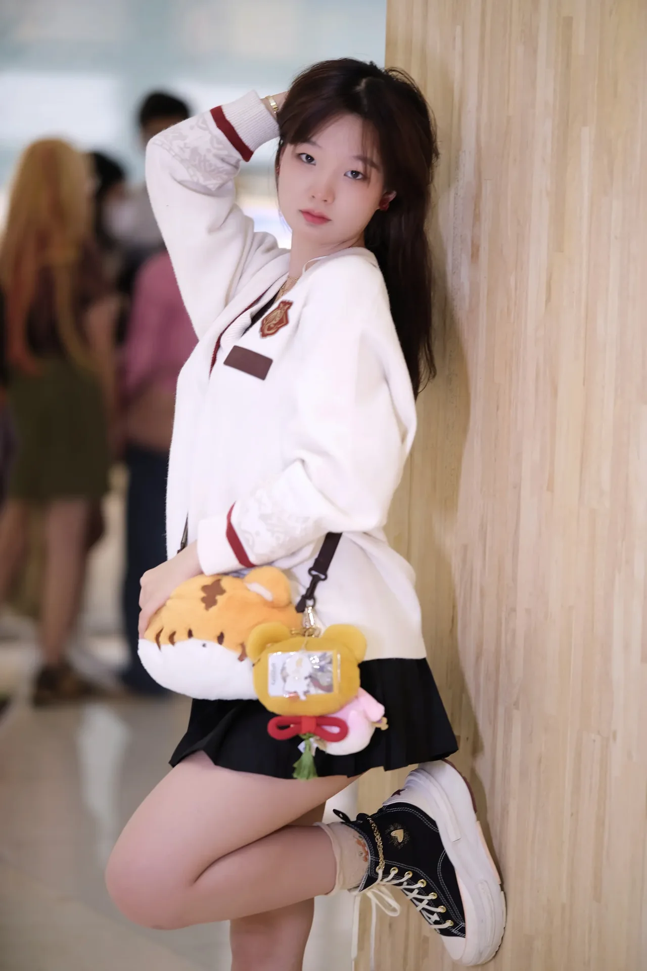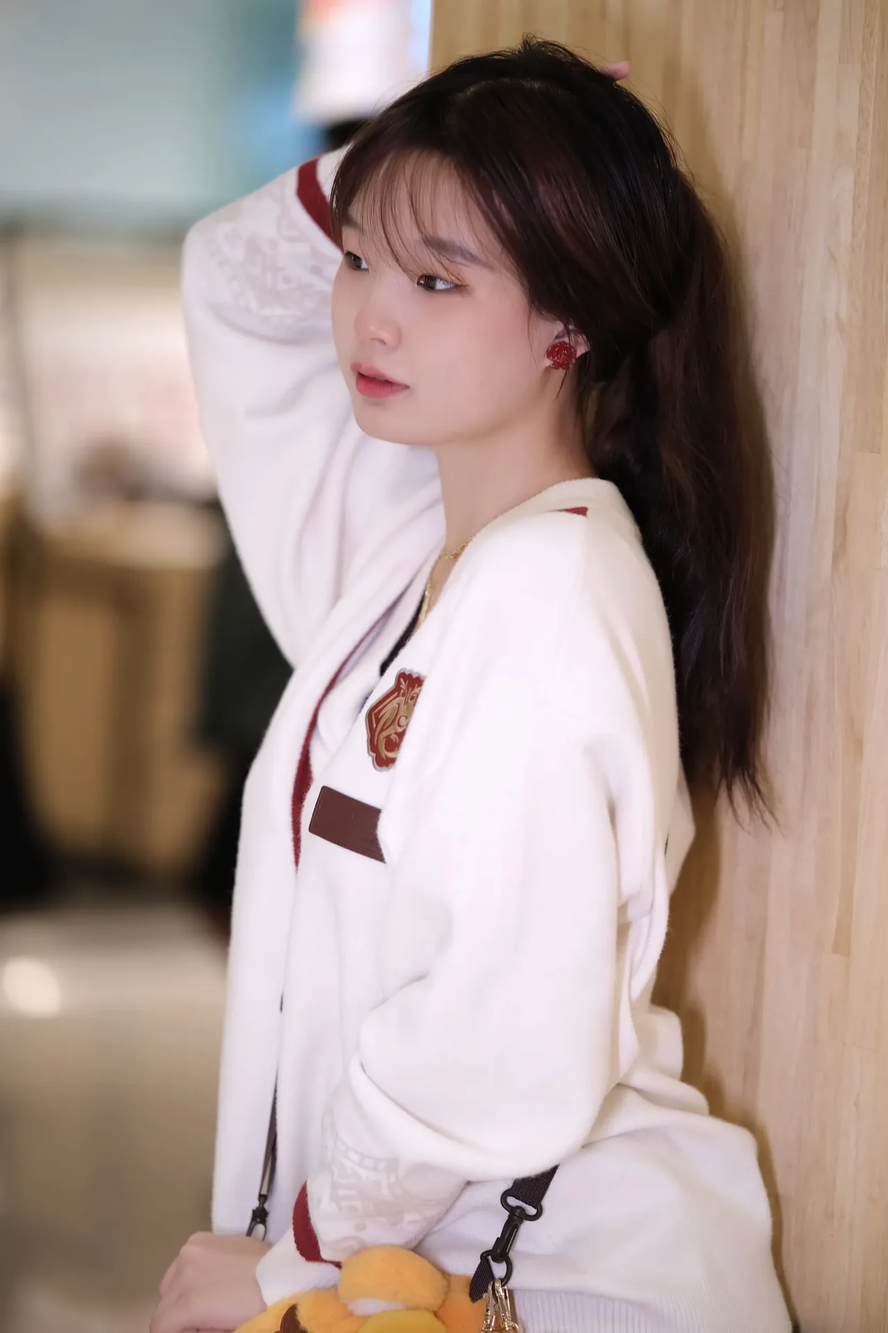 A young woman in a white and red hoodie with dragon emblem and leather patches poses against a wooden backdrop, blending casual elegance with subtle fantasy elements.
