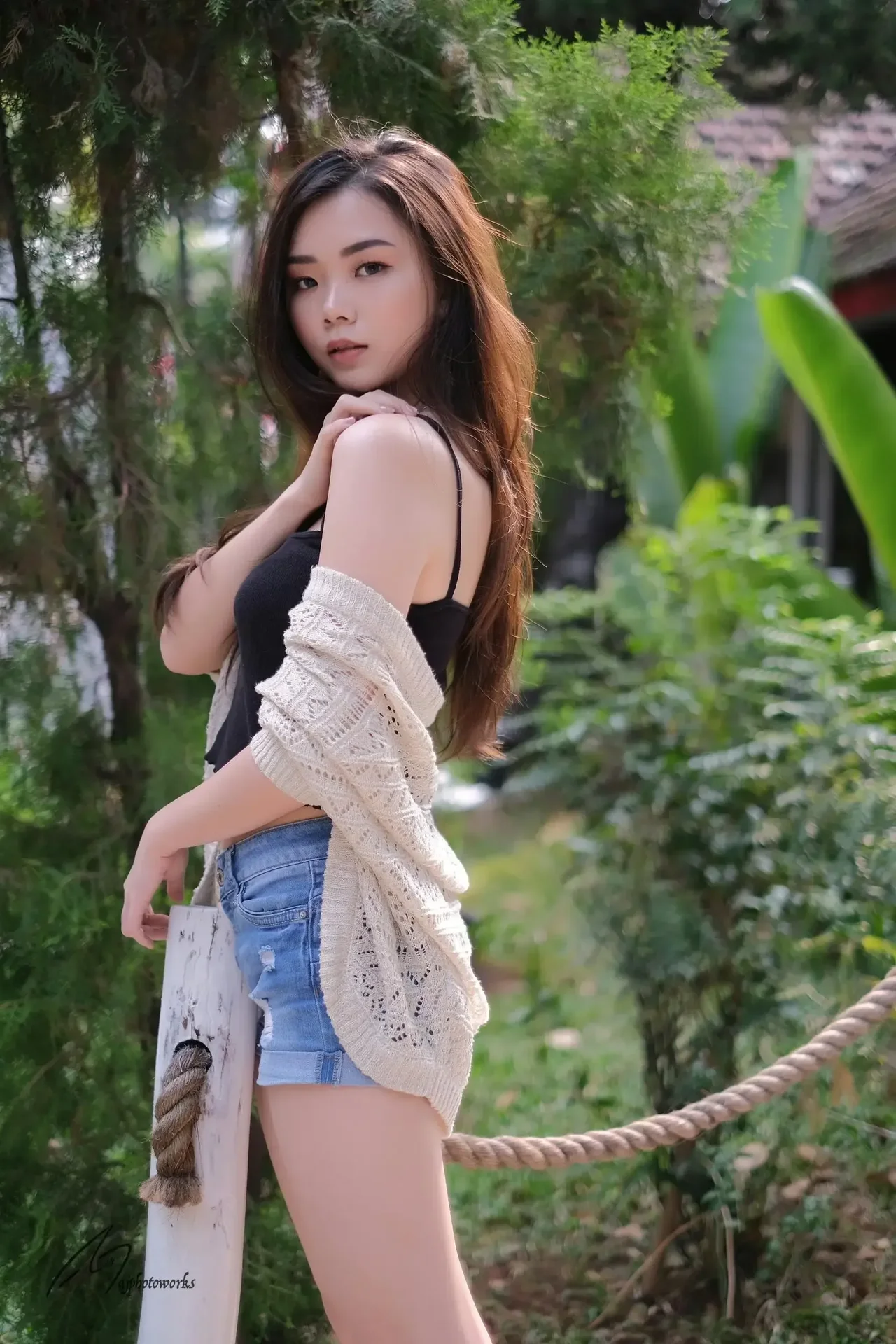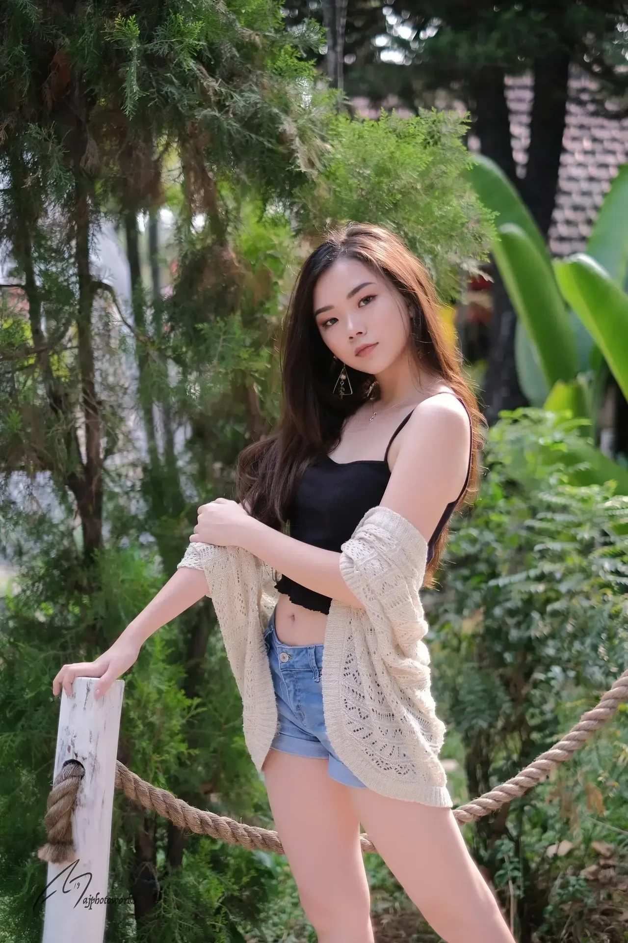 Warm sunlight filters through lush greenery, highlighting the contrast between casual denim and delicate lace in a serene outdoor setting.