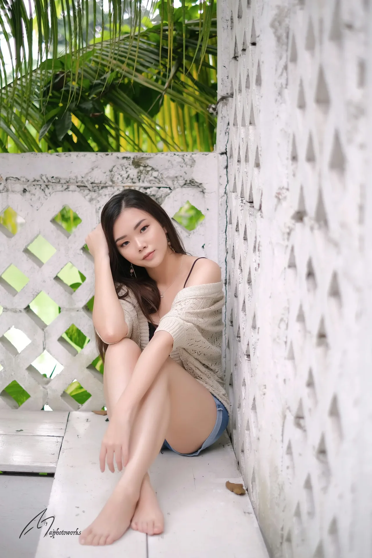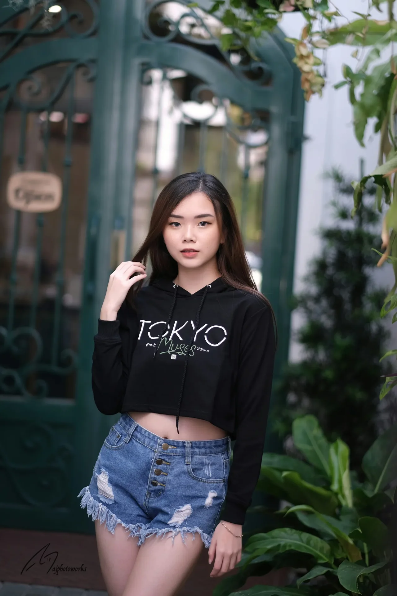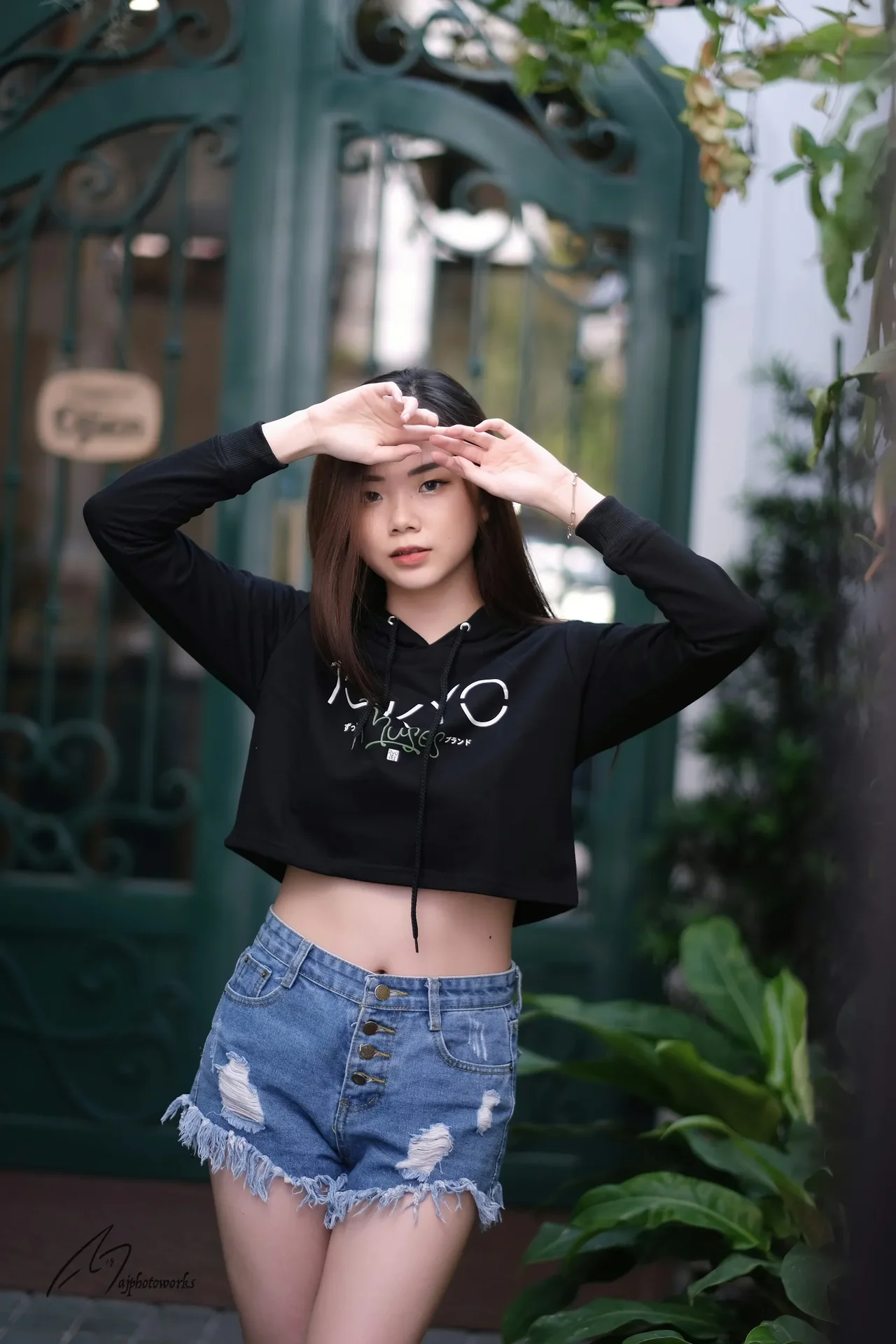 A young woman in a black hoodie and distressed denim shorts poses playfully in urban and casual settings, blending edgy and relaxed vibes.