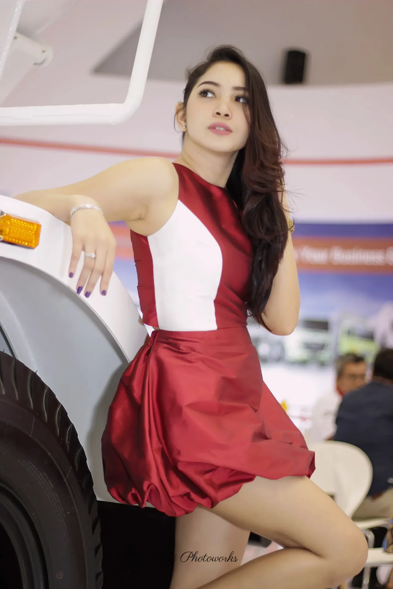 A stylish young woman in a red and white satin dress poses confidently in a vibrant indoor event space, highlighting elegance and poise.