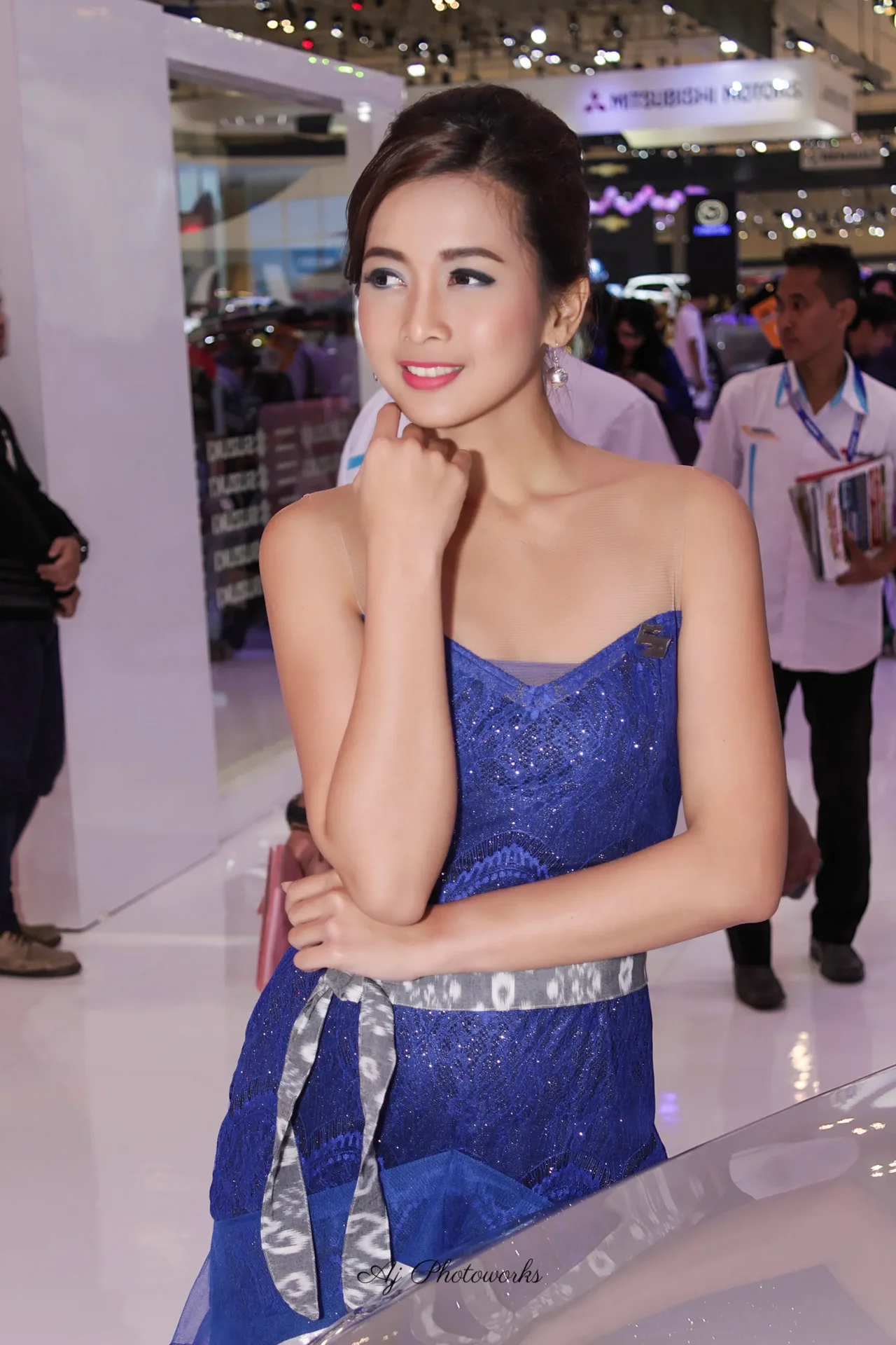 A poised brand ambassador at an automotive event radiates elegance in a bright blue gown, blending sophistication with confidence amidst sleek car displays.