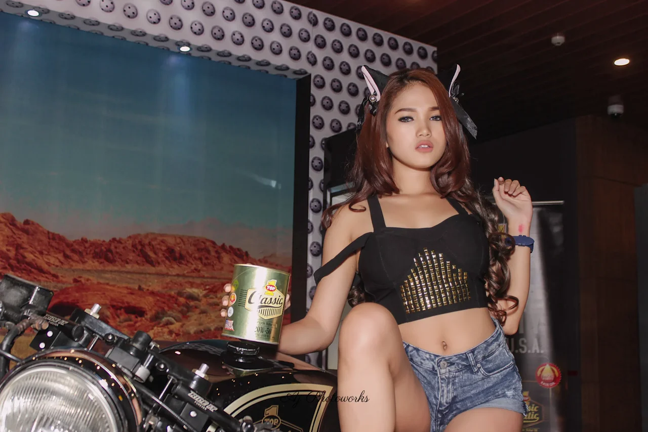 A stylish desert-inspired studio shoot blending edgy fashion with motorcycle culture.