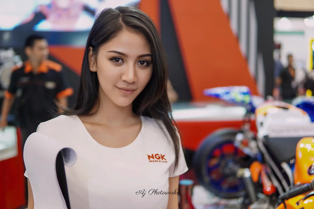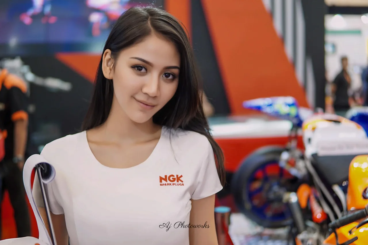 Polished Elegance Meets Mechanical Precision: A showgirl's poise contrasts with vibrant motorcycles at a dynamic exhibition space.