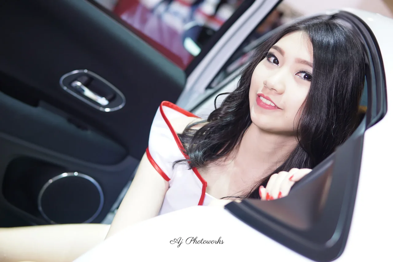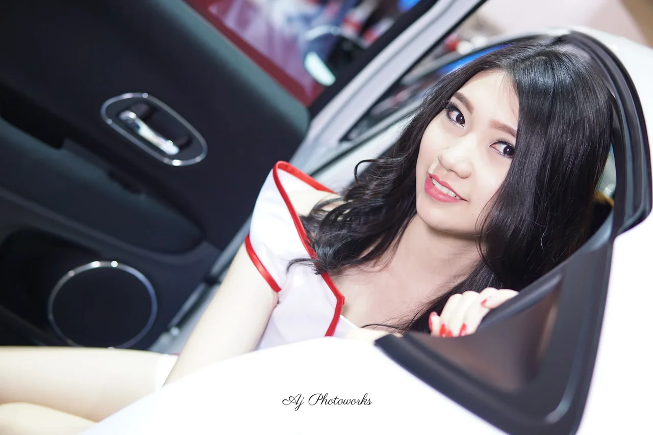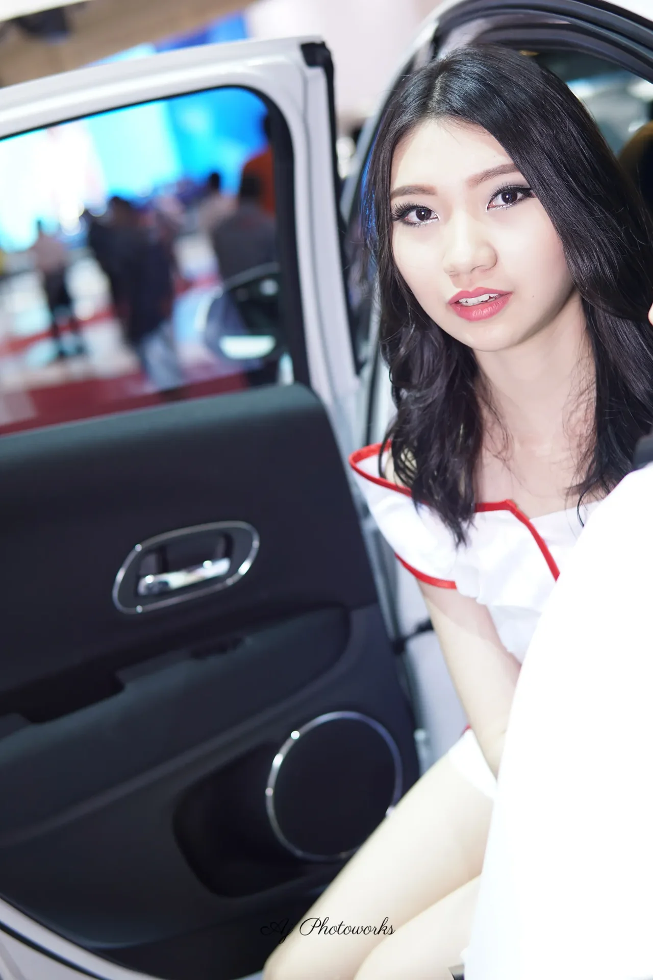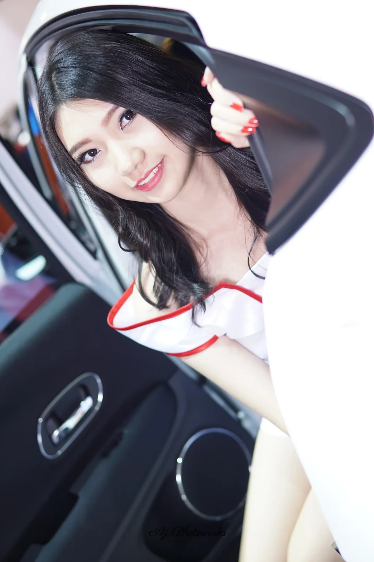 Striking contrast between vibrant red accents and elegant white attire in a dynamic automotive setting.