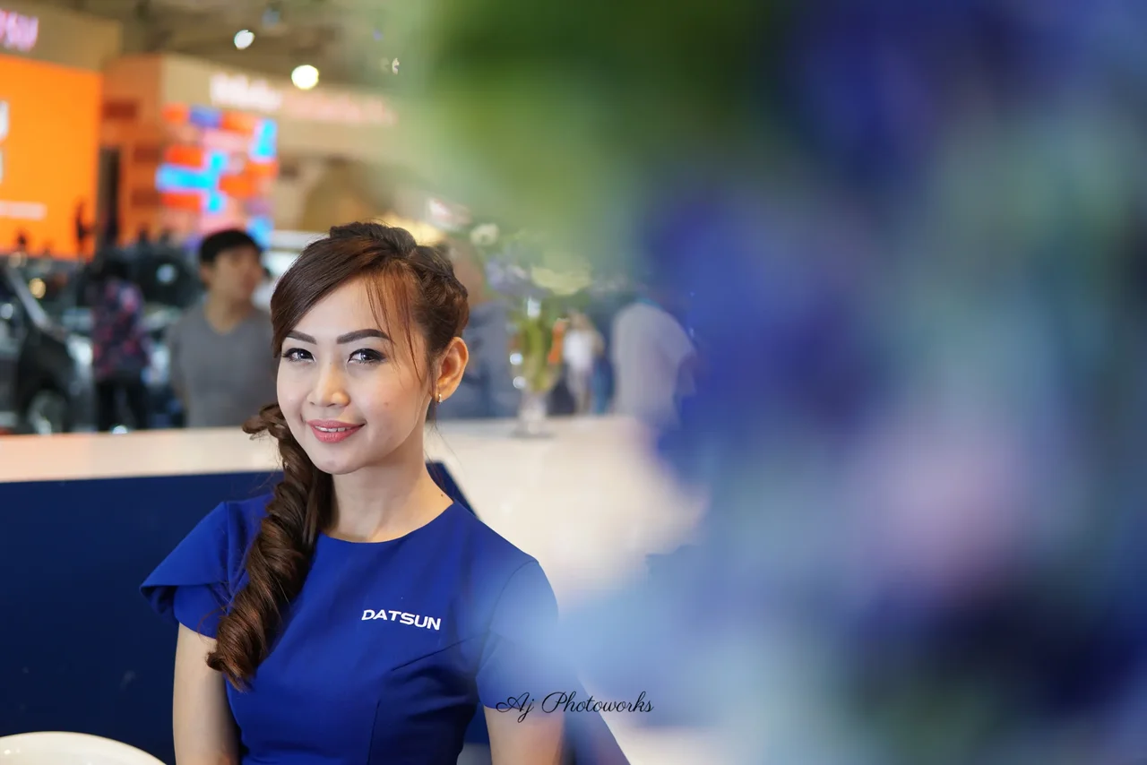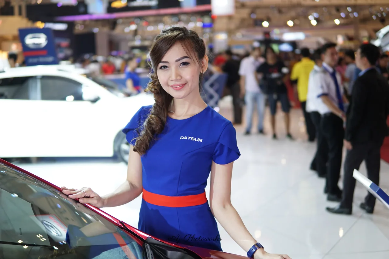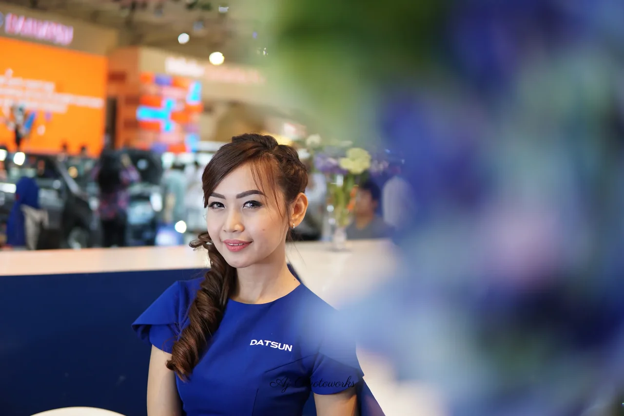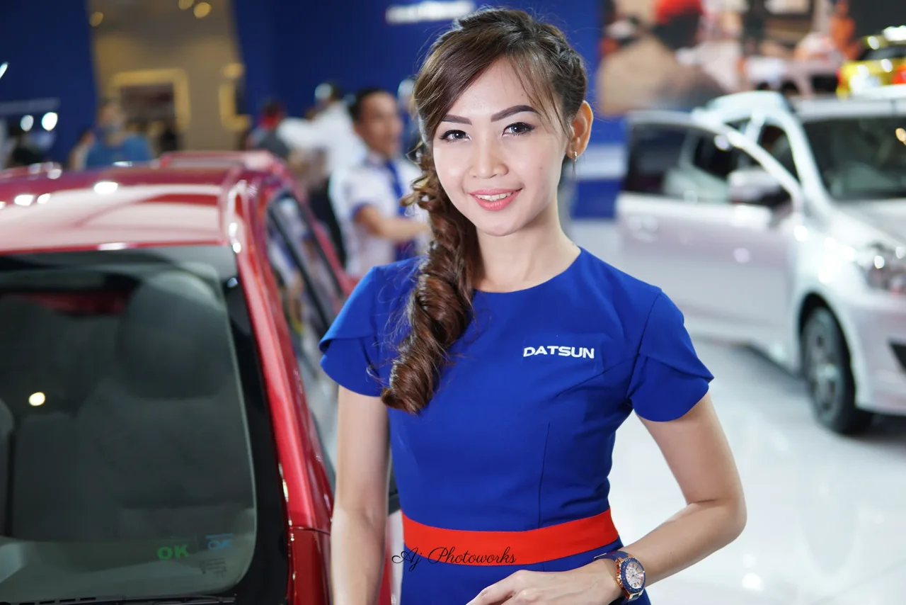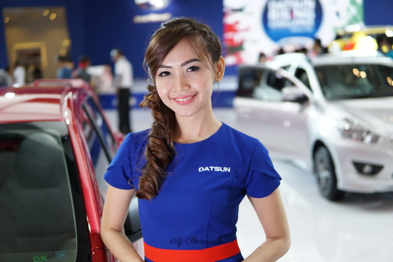 A woman in a blue Datsun-branded dress poses confidently at a car show, surrounded by sleek vehicles and vibrant promotional displays.