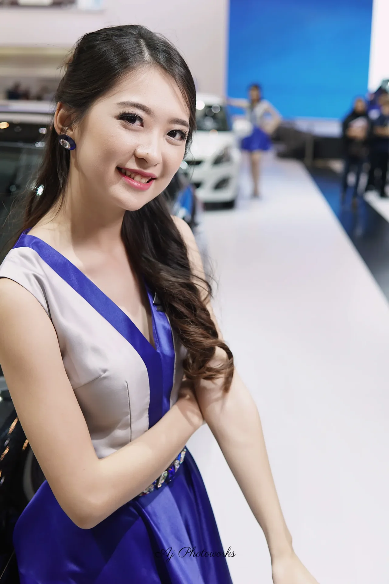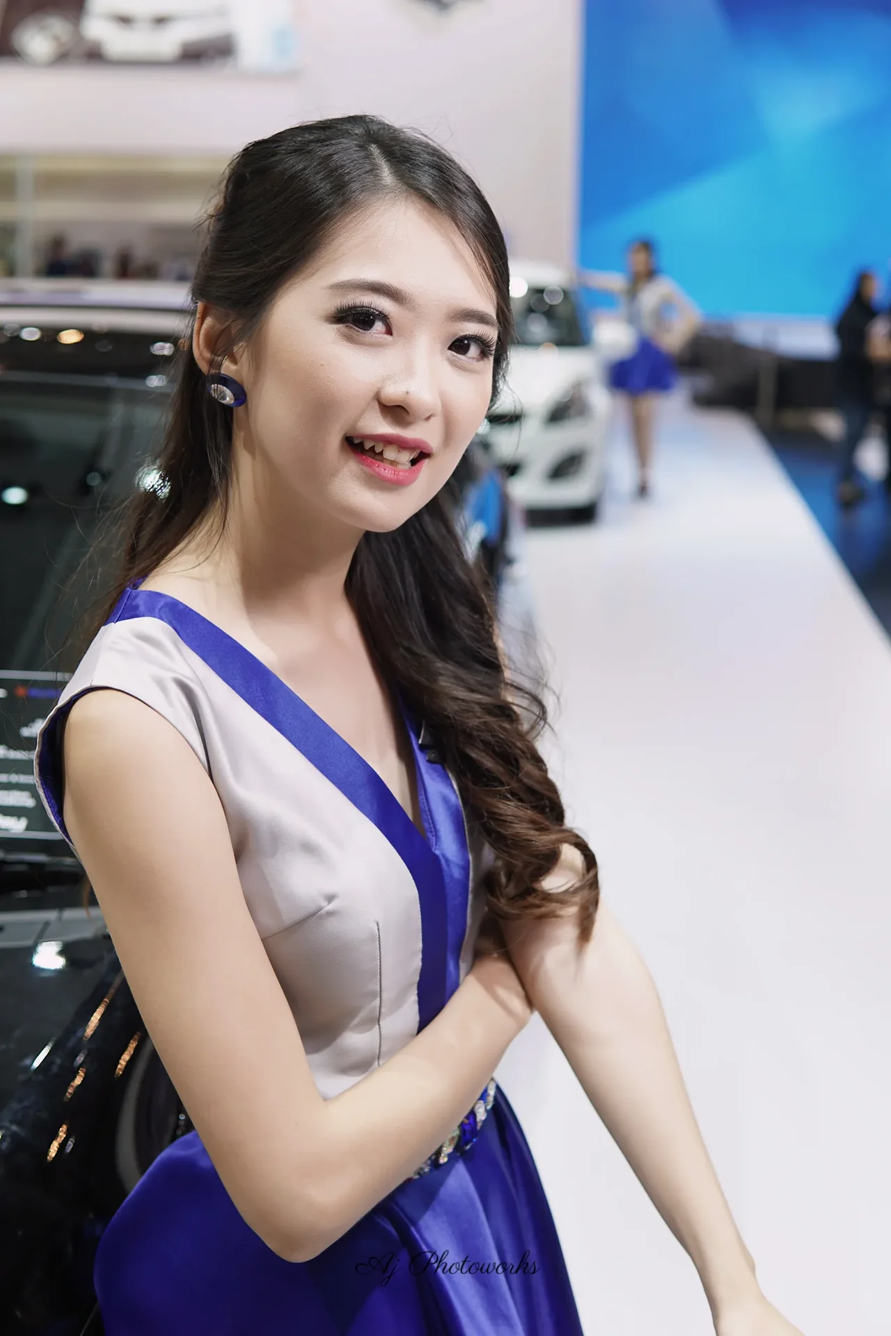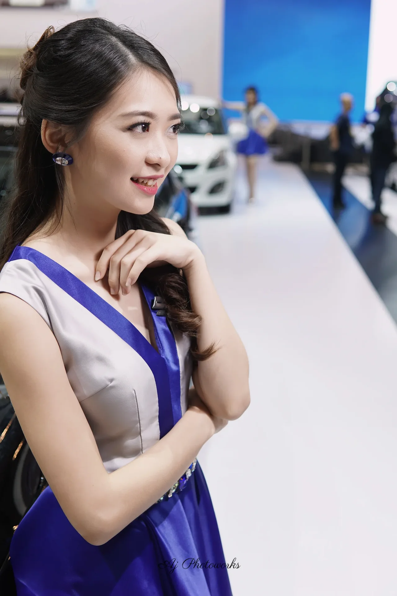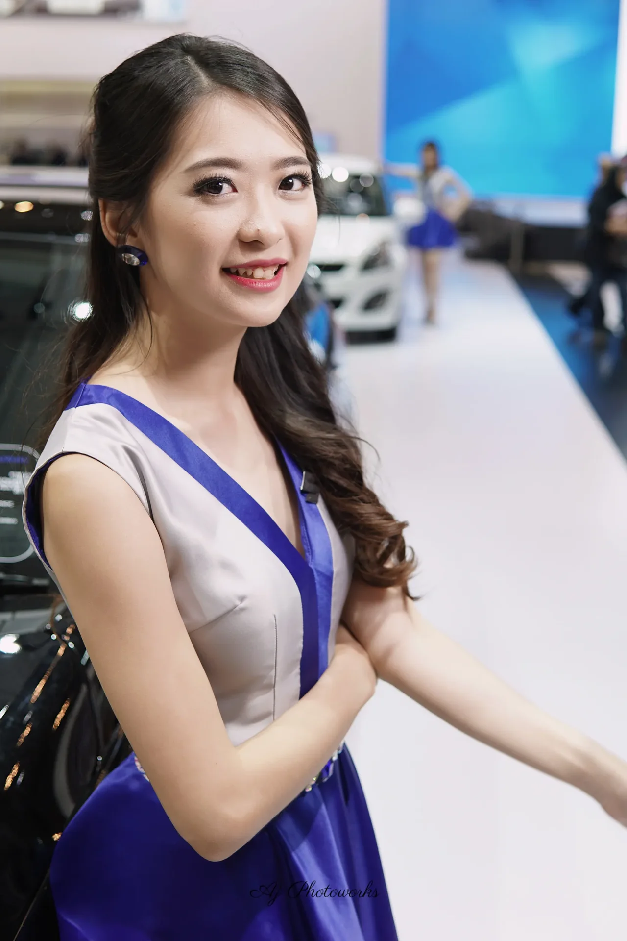 A person wearing a sleeveless white and blue dress with trim on their shoulders. They are in a car showroom or exhibition environment, holding their dark wavy hair elegantly while wearing metallic earrings. The scene is bright with soft lighting, featuring display cars and a blue-lit backdrop in the background.