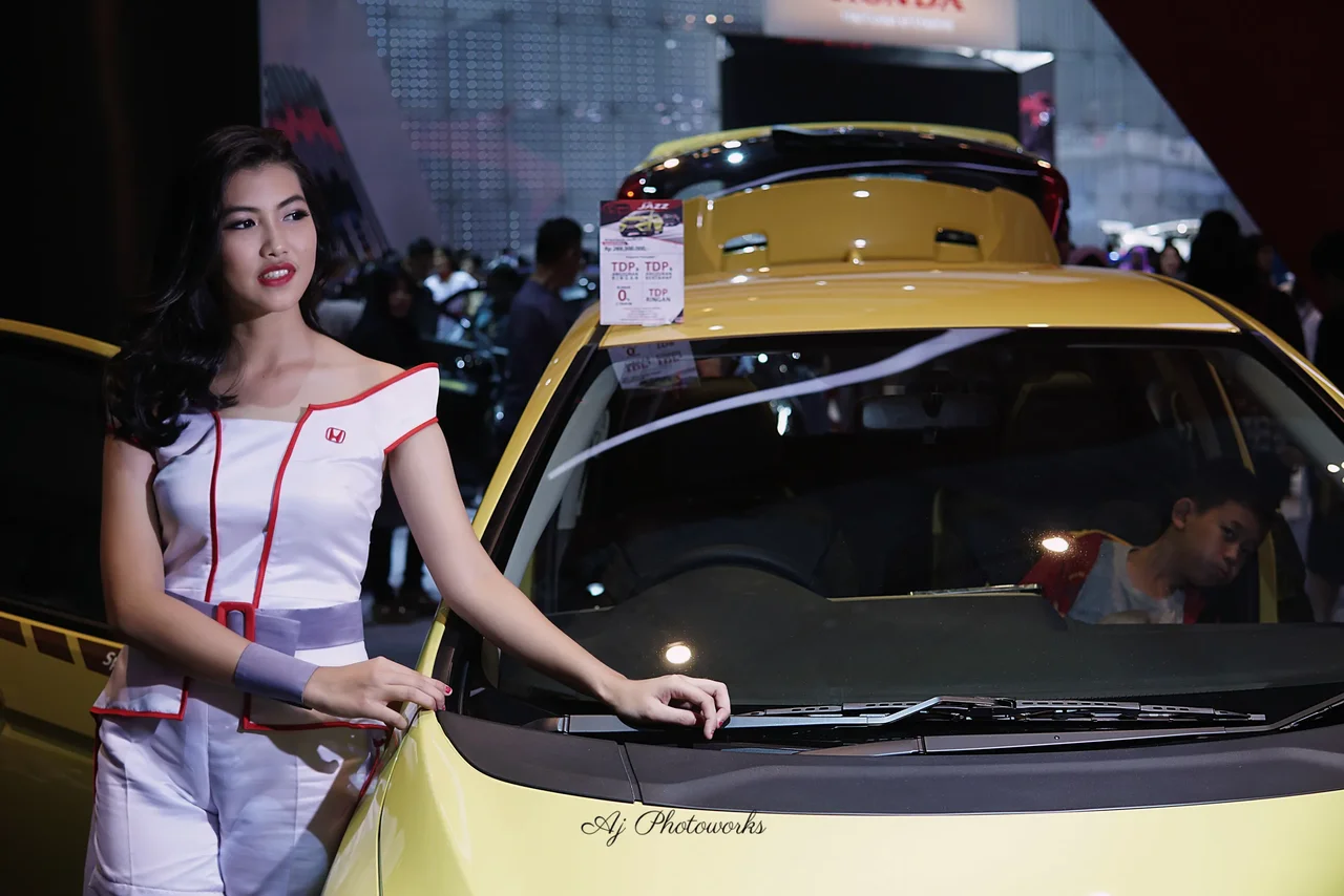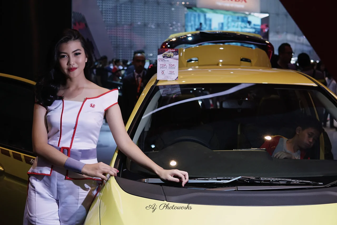 A vibrant promotional model interacts with a sleek Honda taxi at an auto show, blending bold fashion with automotive flair.