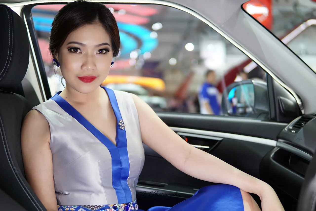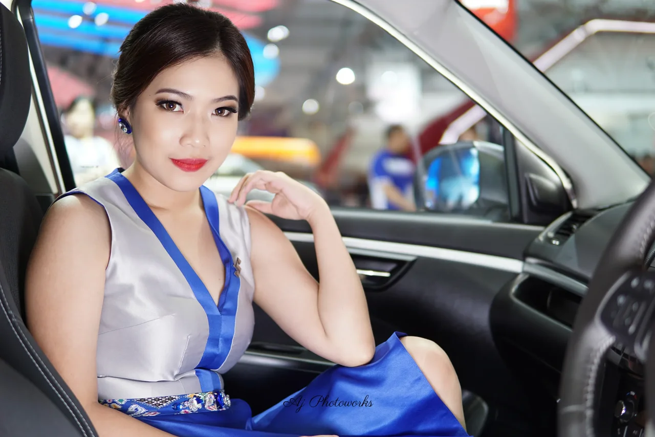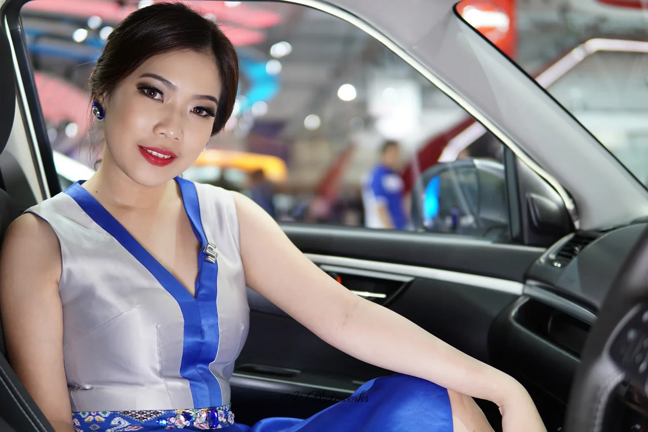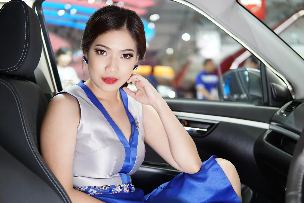 A confident model exudes elegance in a sleek grey and blue ensemble, seated in a modern car interior at a vibrant car show.