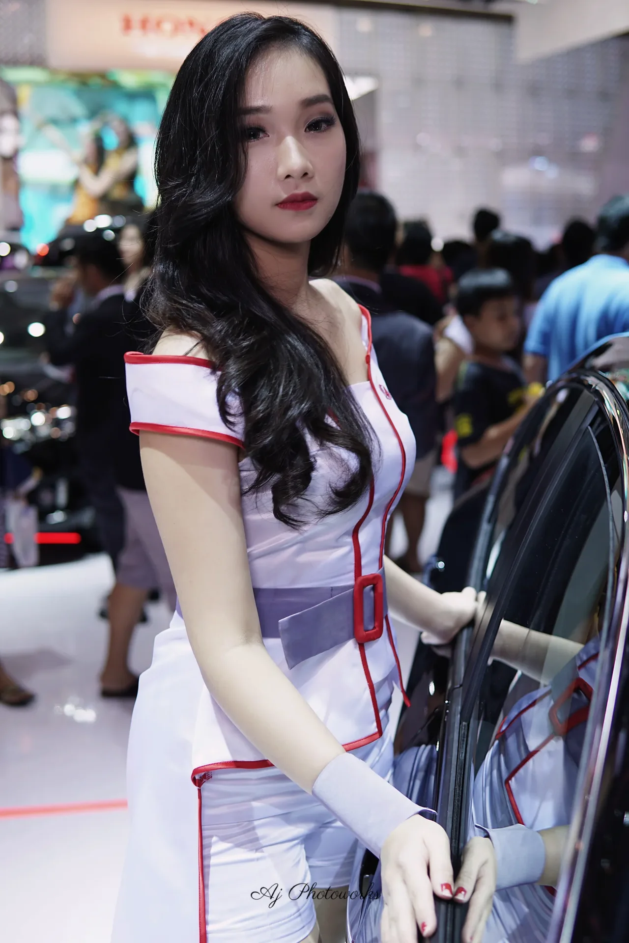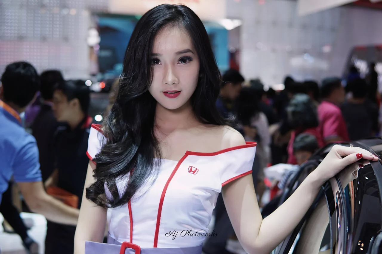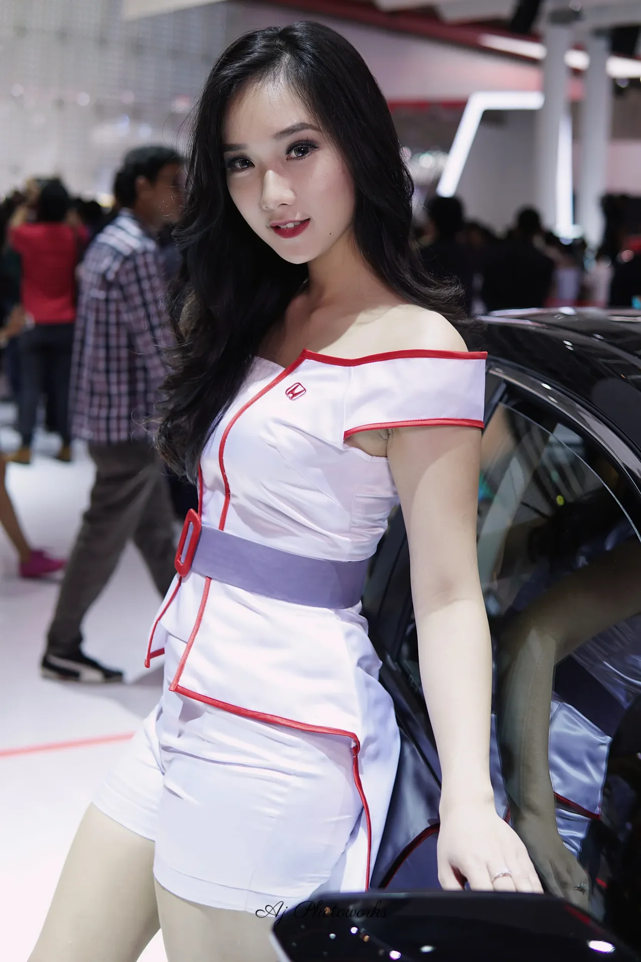 A confident model poses at a car show in a striking white and red Honda-themed outfit, blending fashion and automotive promotion.