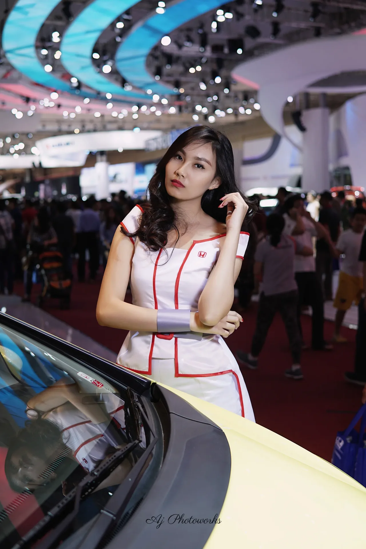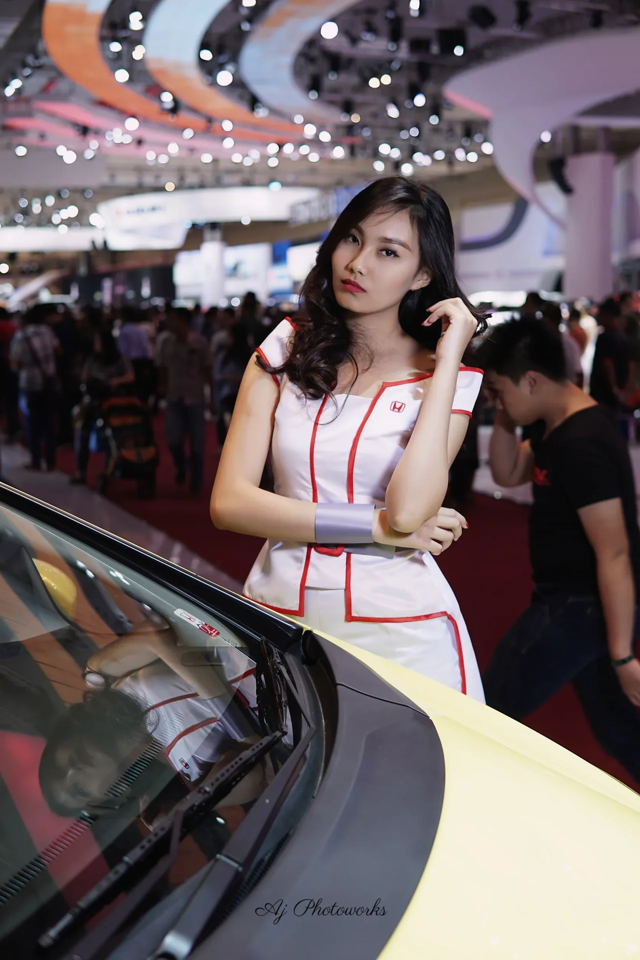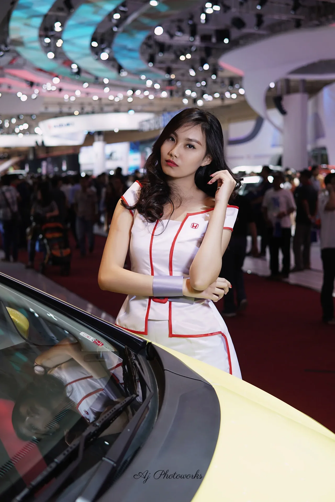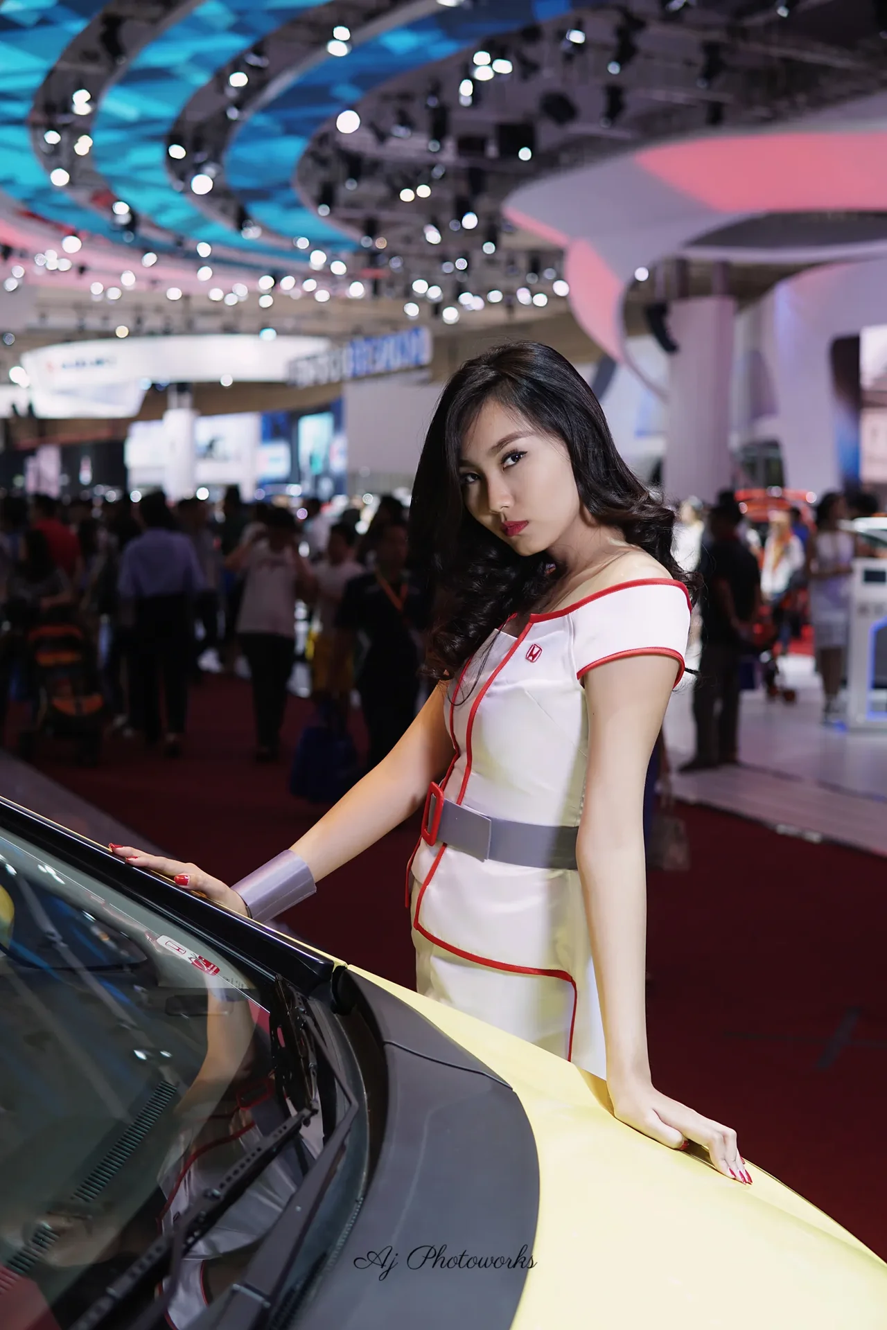 A poised woman in a red-and-white dress interacts with a car at a bustling auto show, surrounded by vibrant indoor lighting and a lively crowd.