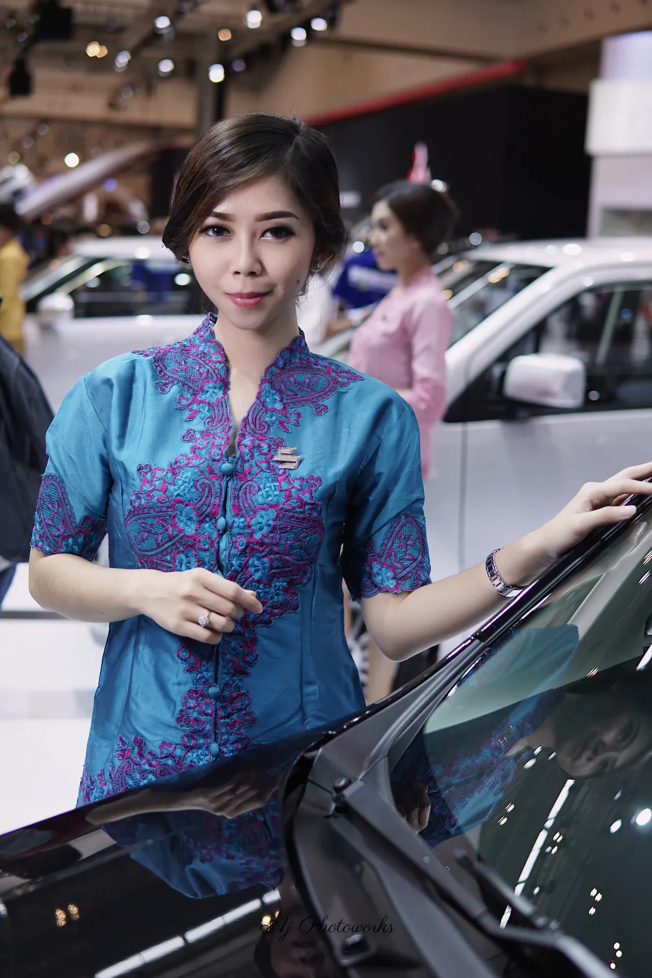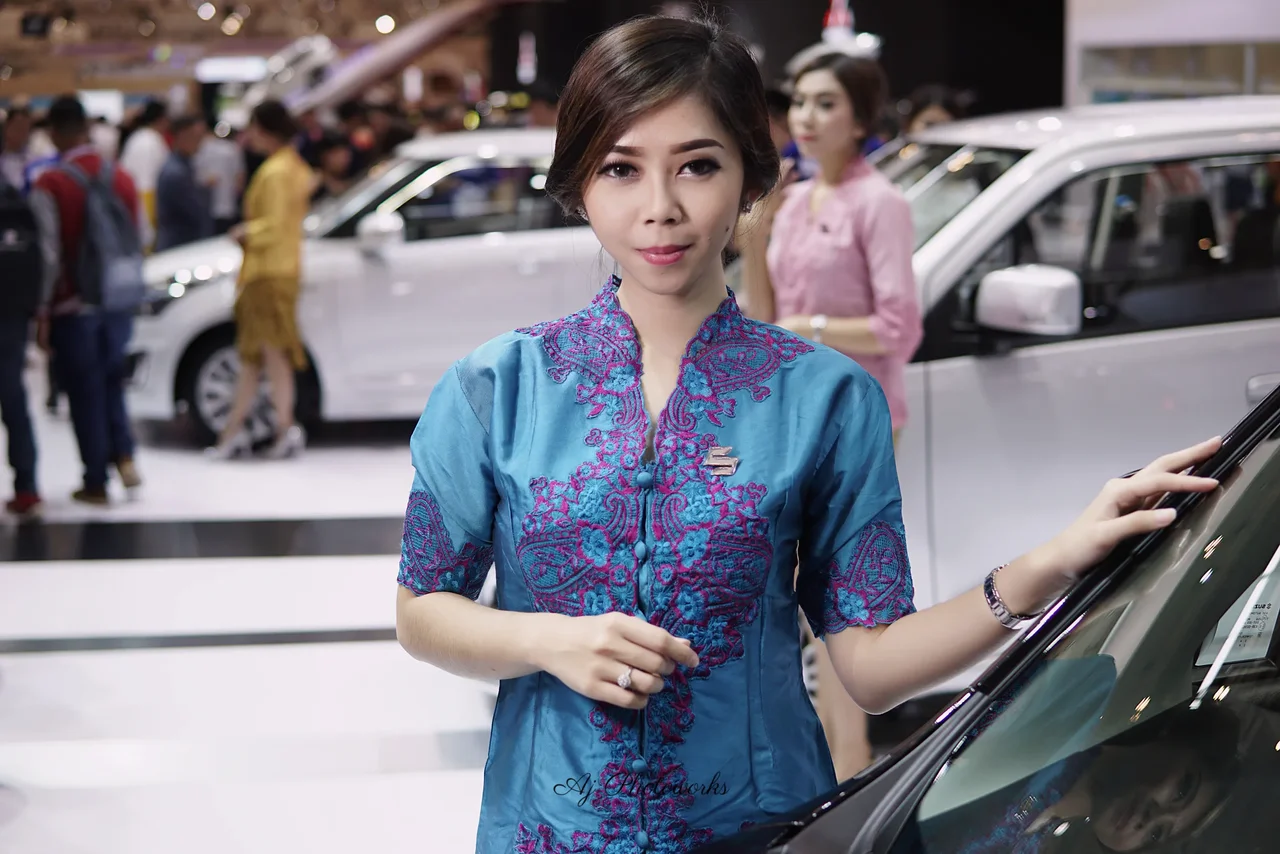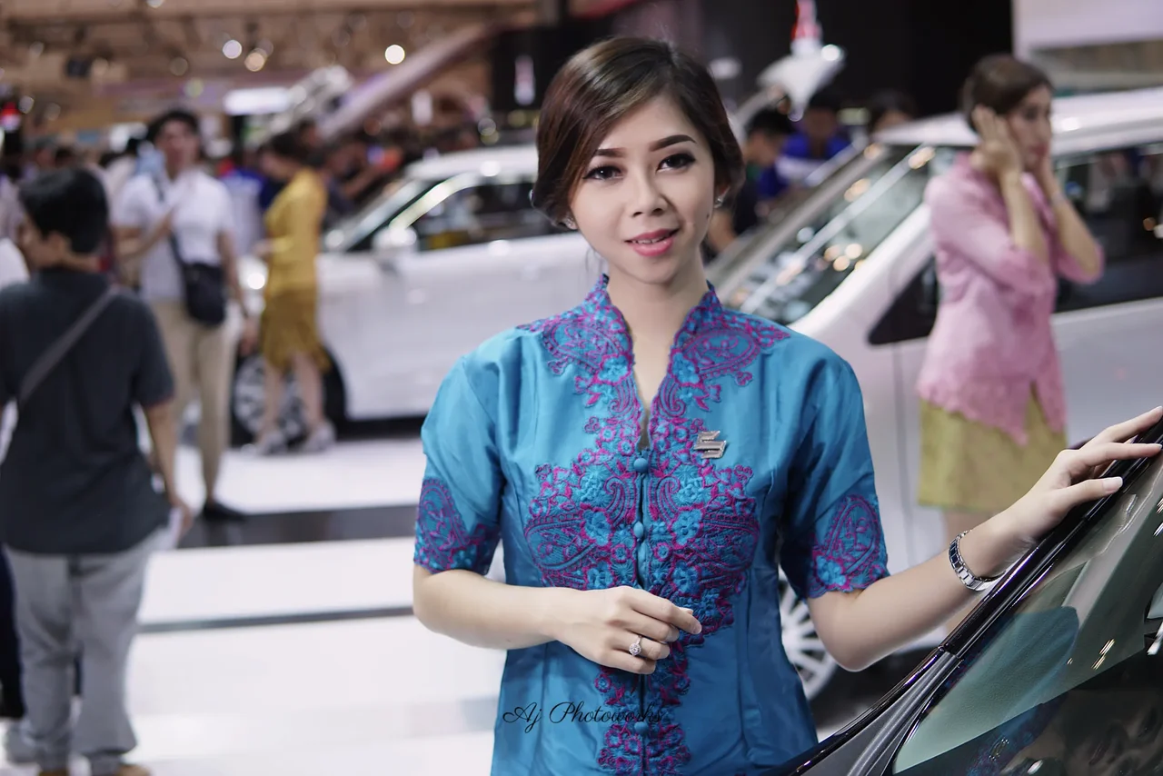 A woman in a traditional blue and purple embroidered blouse admires a car at a bustling exhibition hall, surrounded by modern vehicles and vibrant lighting.