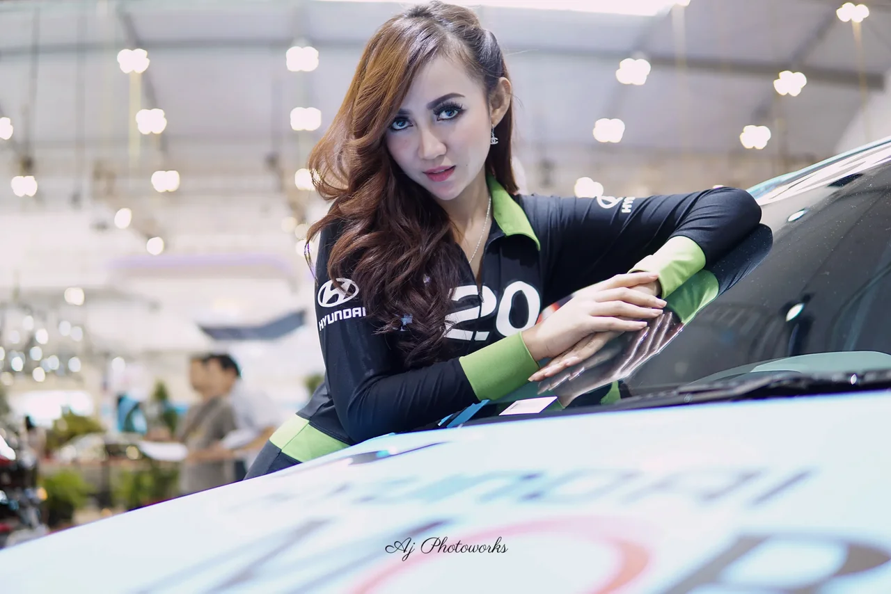 A model in a Hyundai racing suit leans against a sleek vehicle at an automotive expo, showcasing promotional elegance.