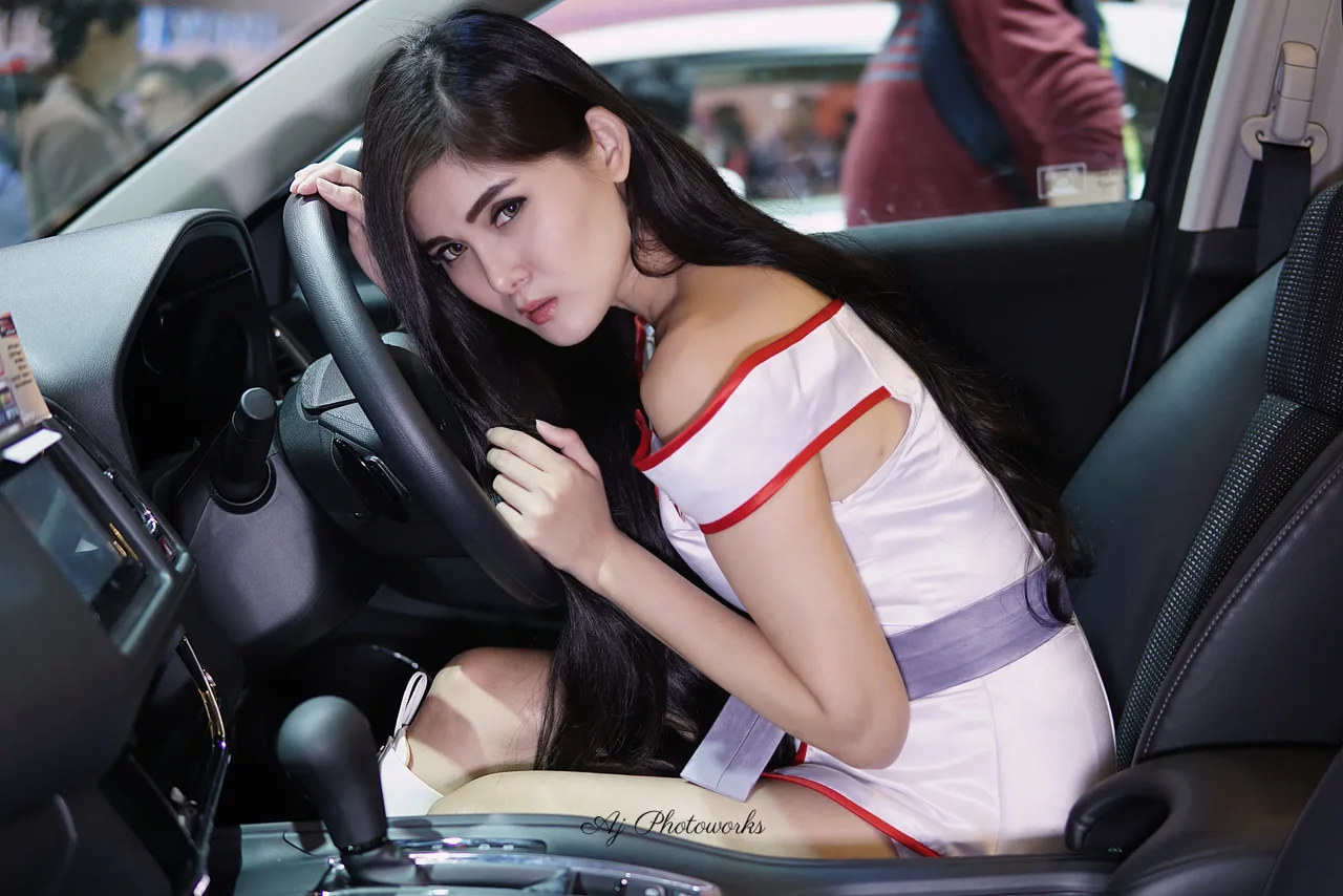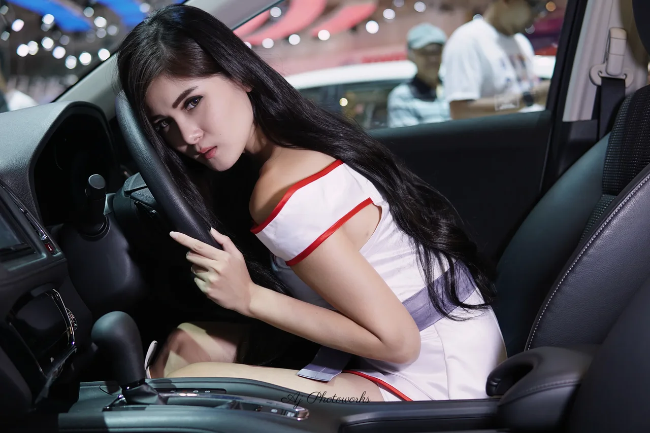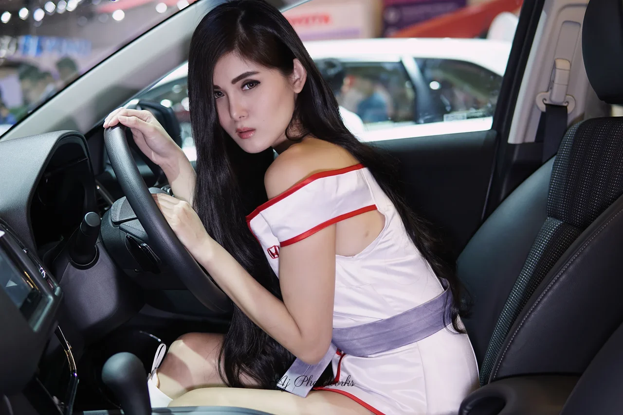 Vibrant fashion meets automotive design in a dynamic portrait set within a lively exhibition space.