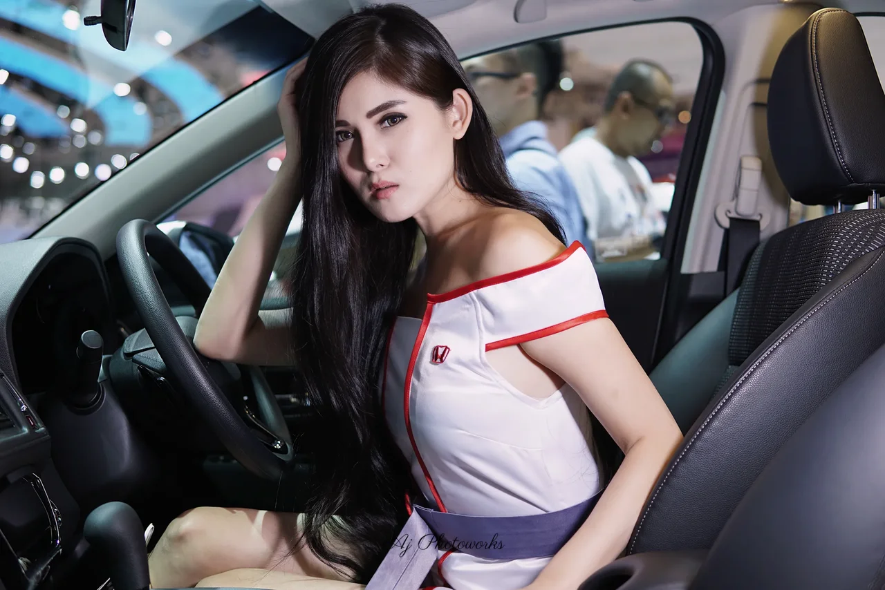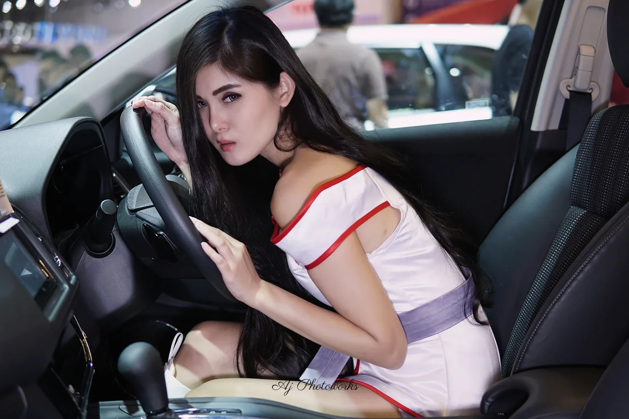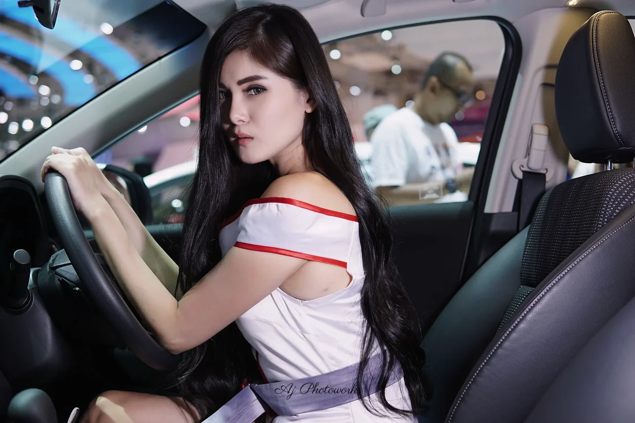 Vibrant fashion meets automotive design in a dynamic portrait set within a lively exhibition space.