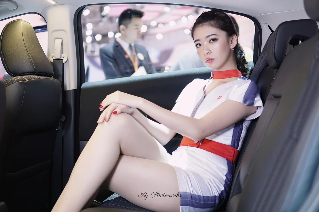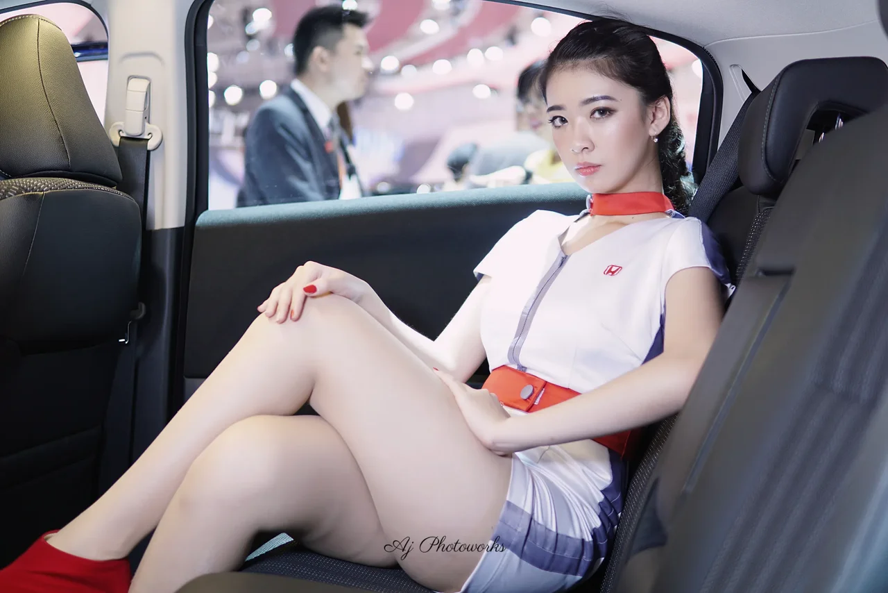 A model in a white and red cosplay-inspired outfit poses in a car interior at an exhibition event.