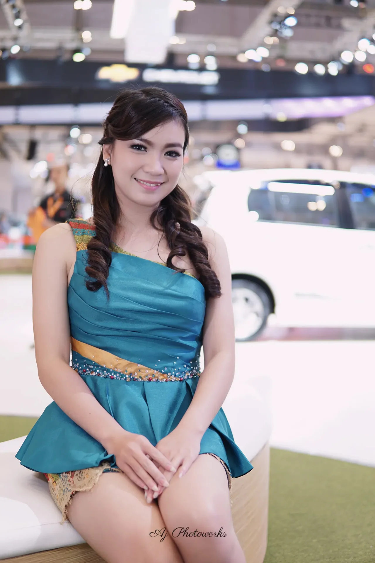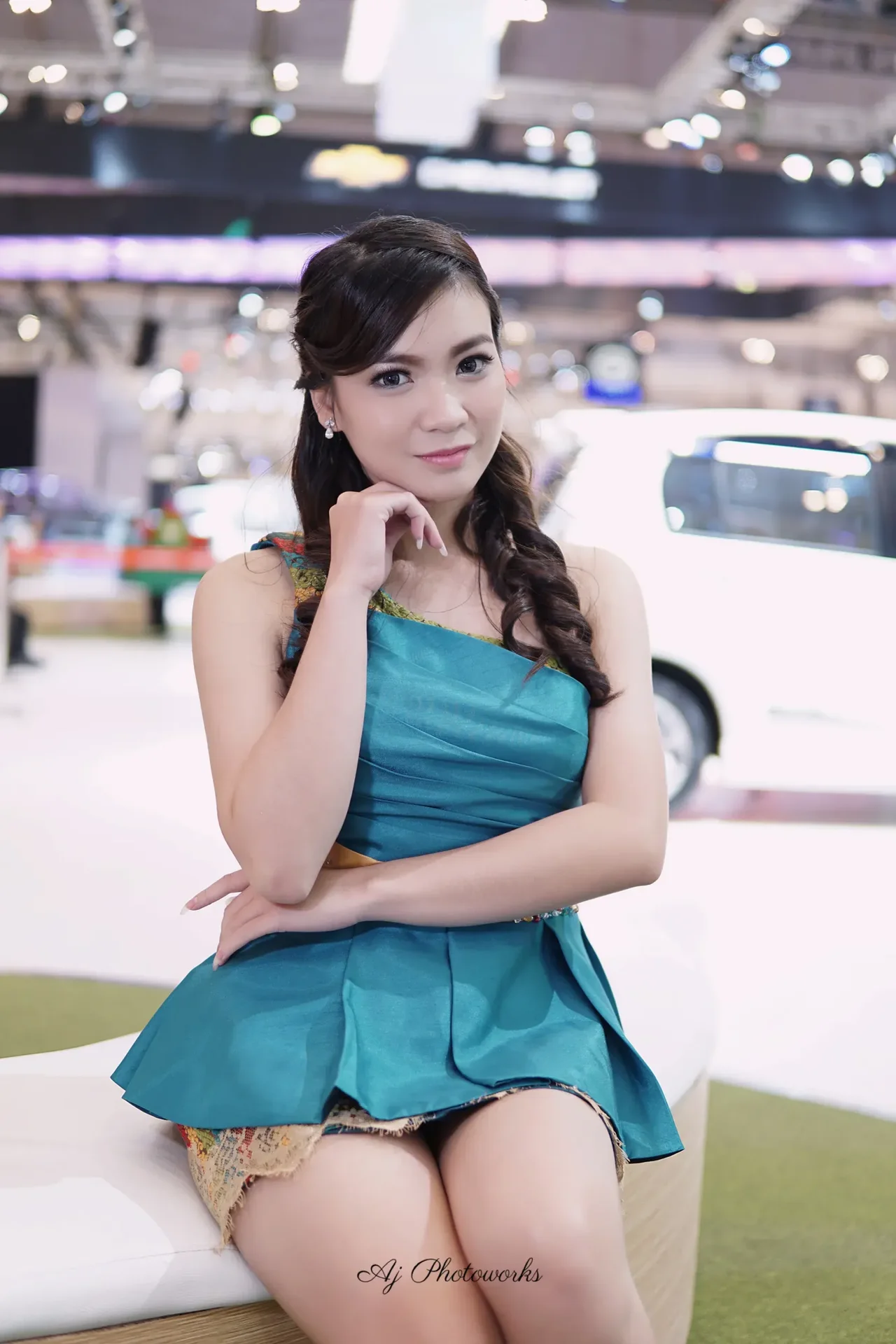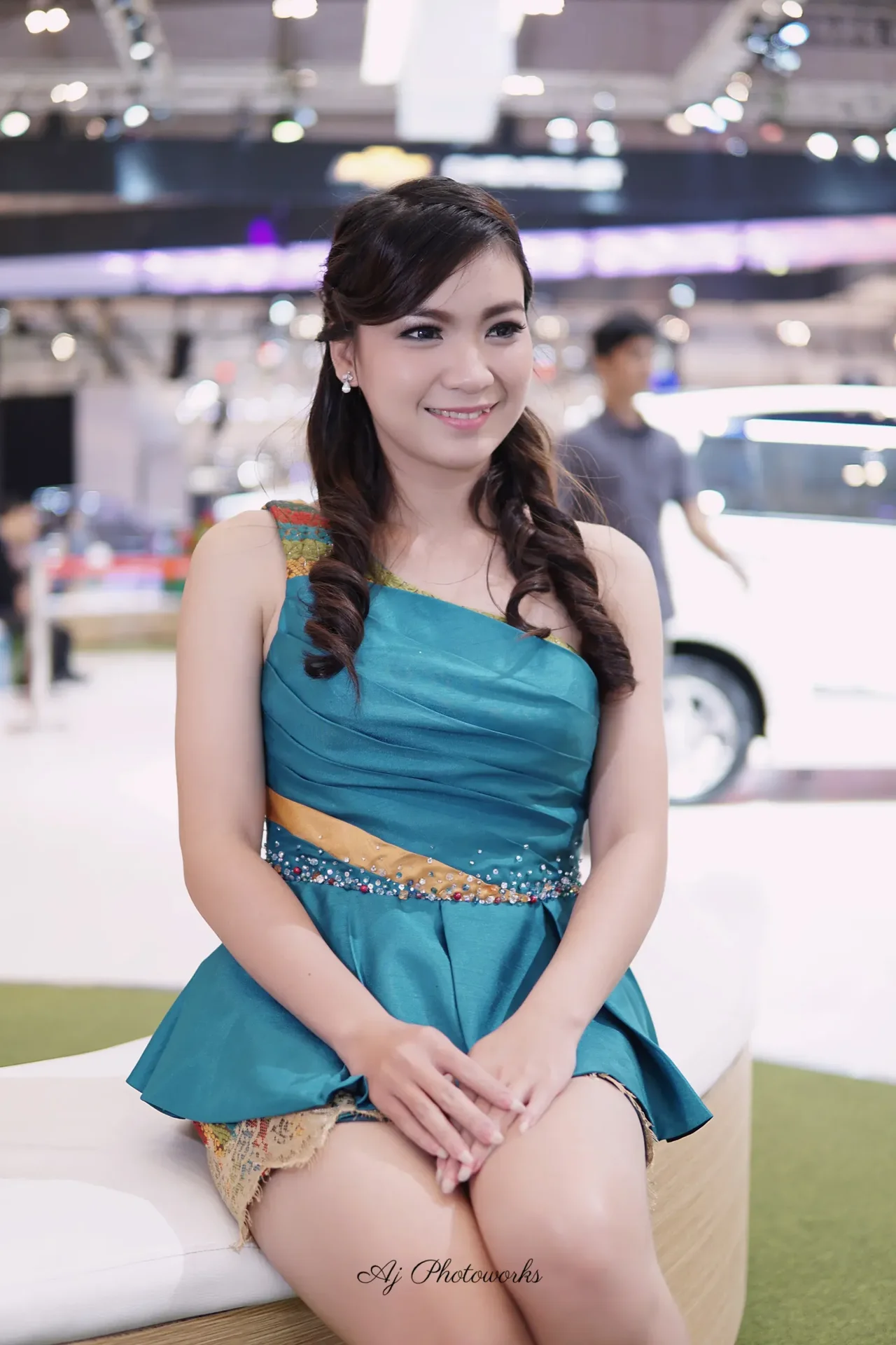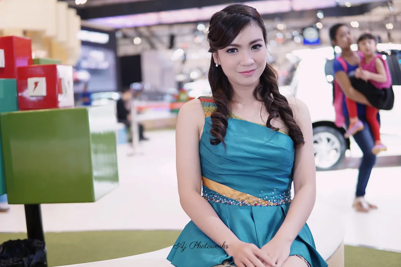 A vibrant teal dress graces the exhibition floor, blending fashion and automotive allure with a lively backdrop of car displays.