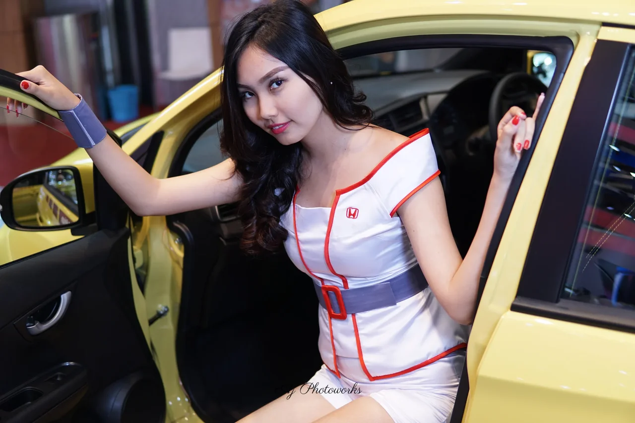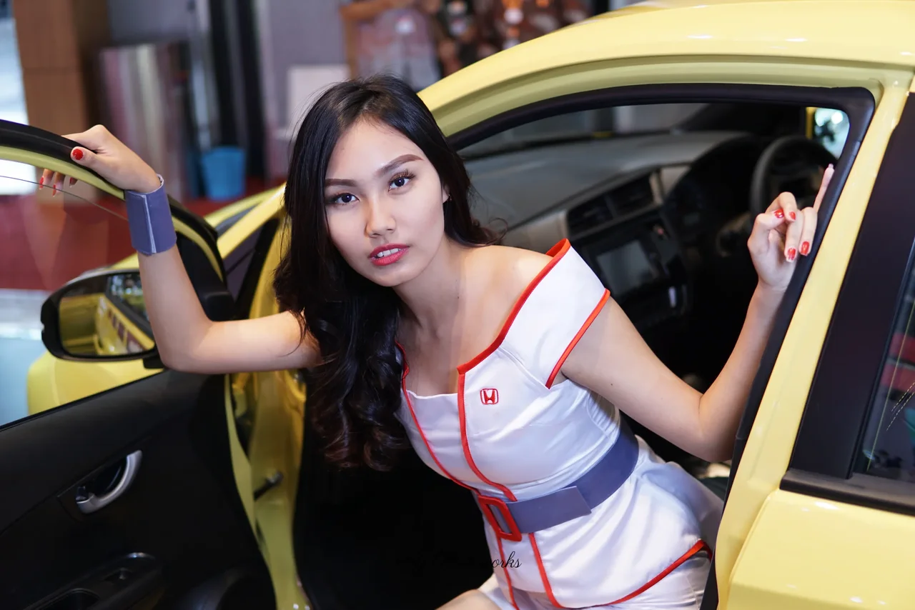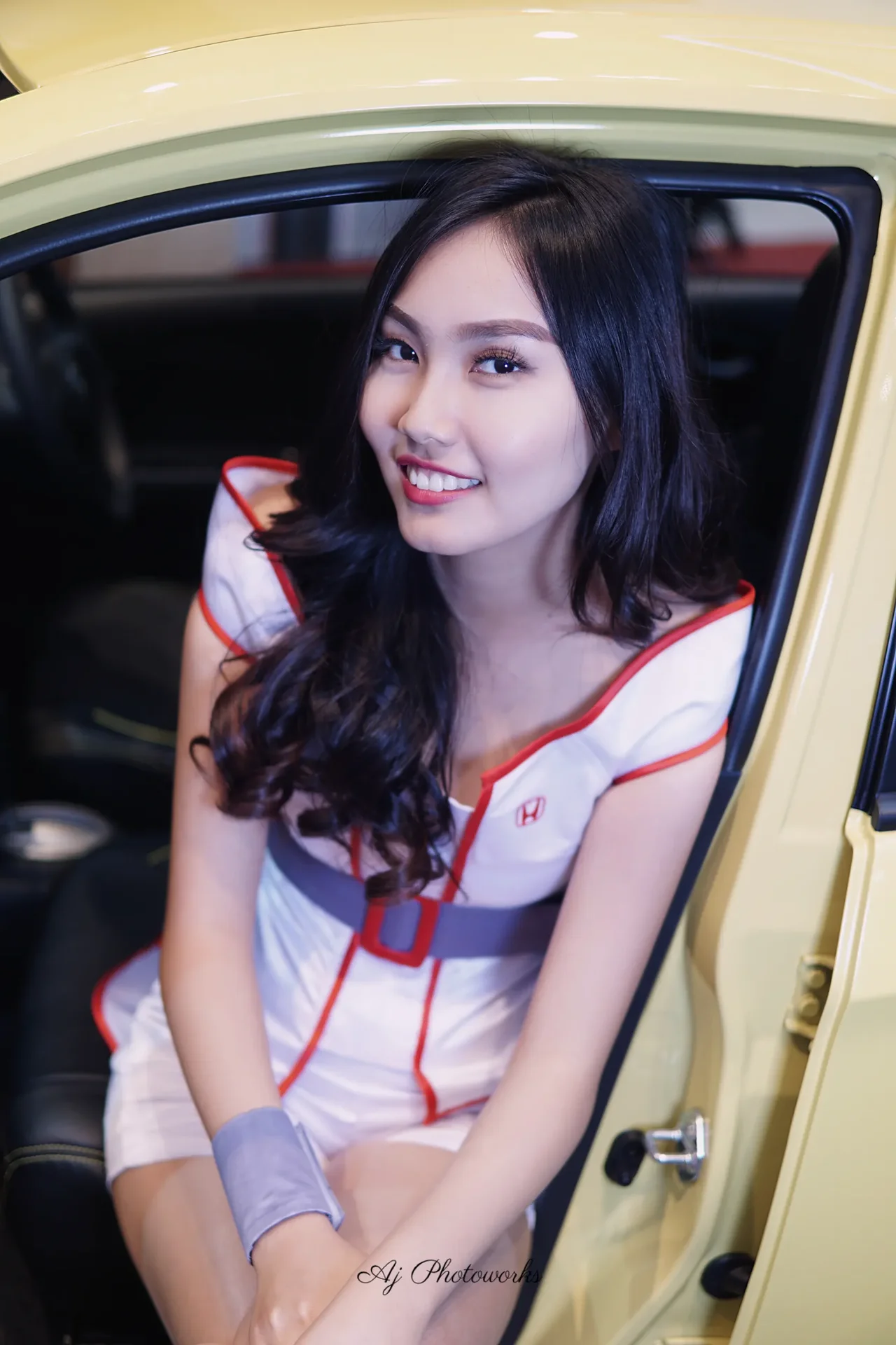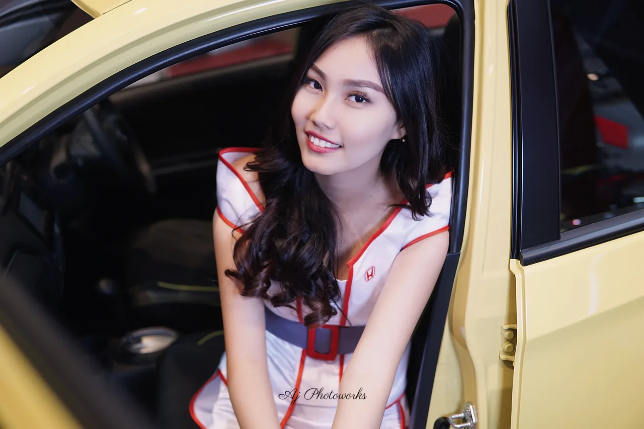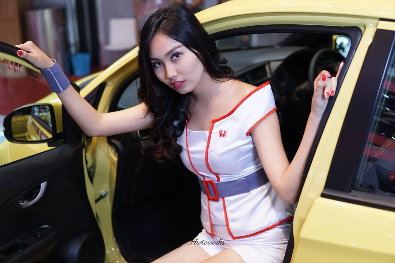 The image exudes vibrancy and precision, with bold contrasts between the racing-inspired costume, sleek car interiors, and dynamic lighting that highlights both warmth and modernity.