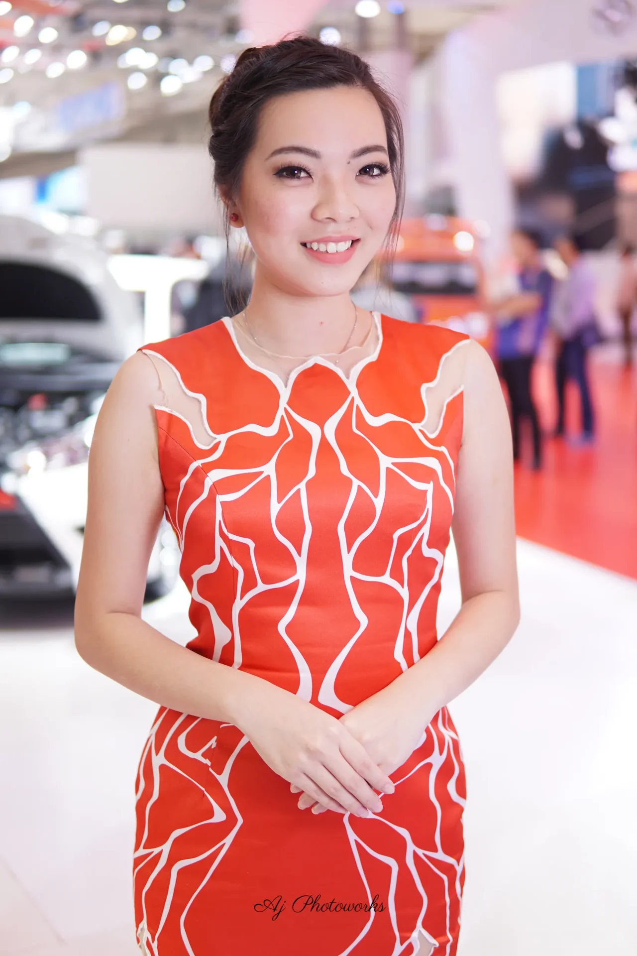 Elegant woman in a red and white patterned dress at a car show, highlighting automotive innovation.