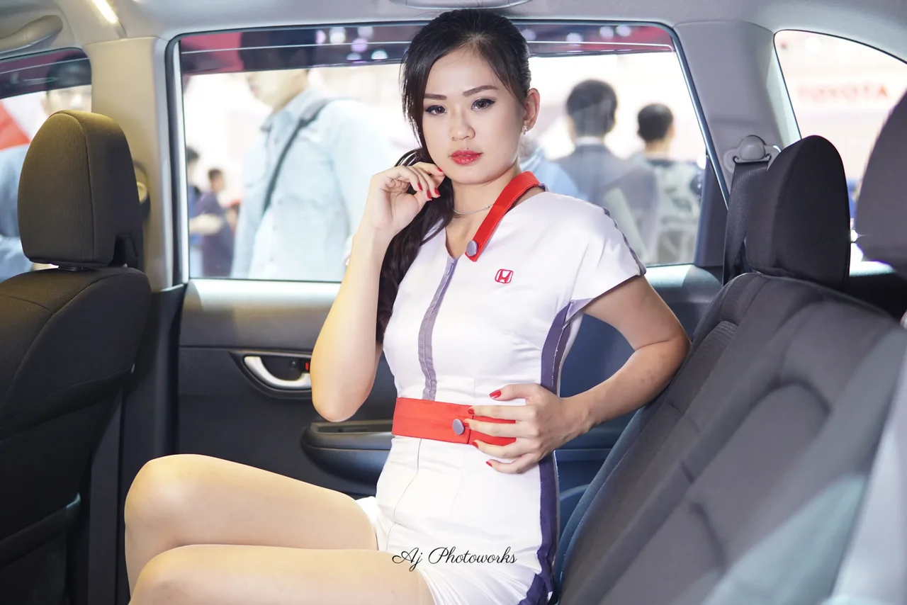 A model poses in a car interior wearing a form-fitting white dress with a striking red belt, set against a professional photoshoot backdrop.