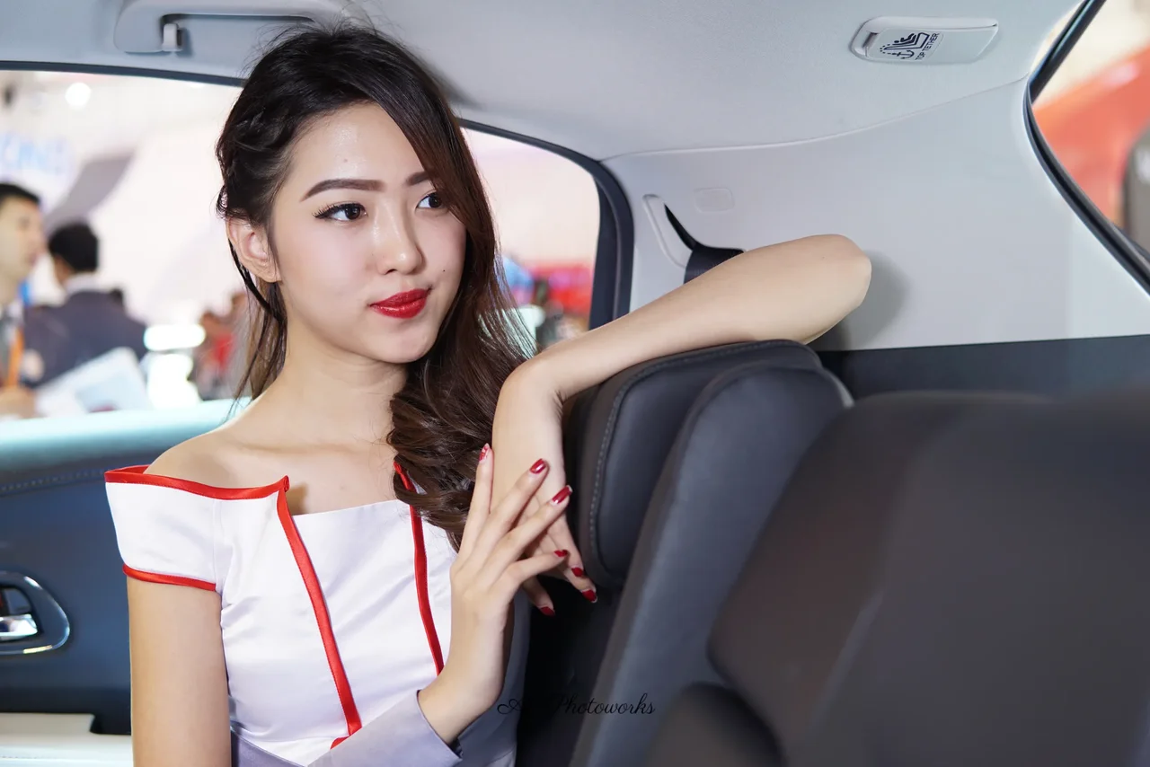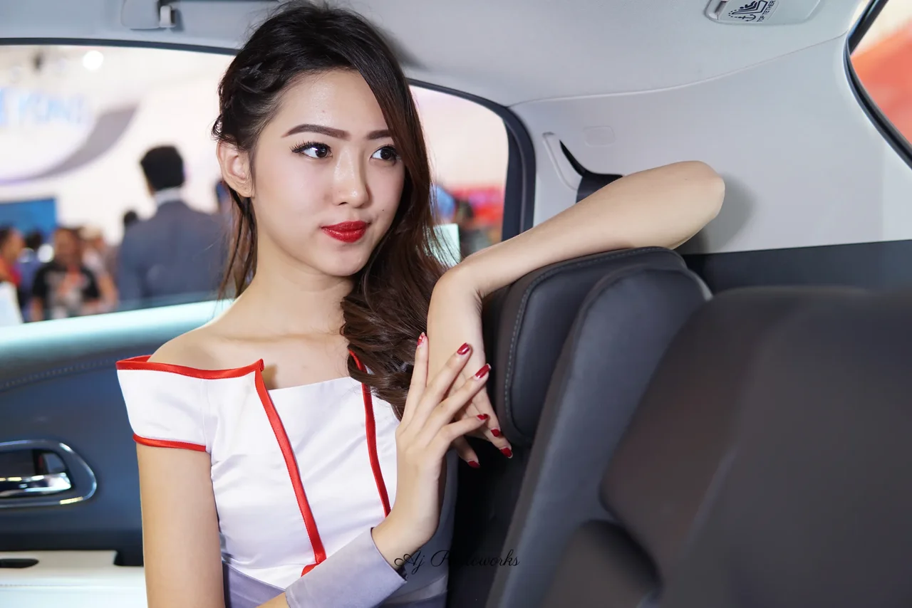 A poised woman embodies elegance in a white and red ensemble, her vibrant accessories contrasting the sleek interior of a luxury car. The blurred backdrop of a car show hints at sophistication and allure.