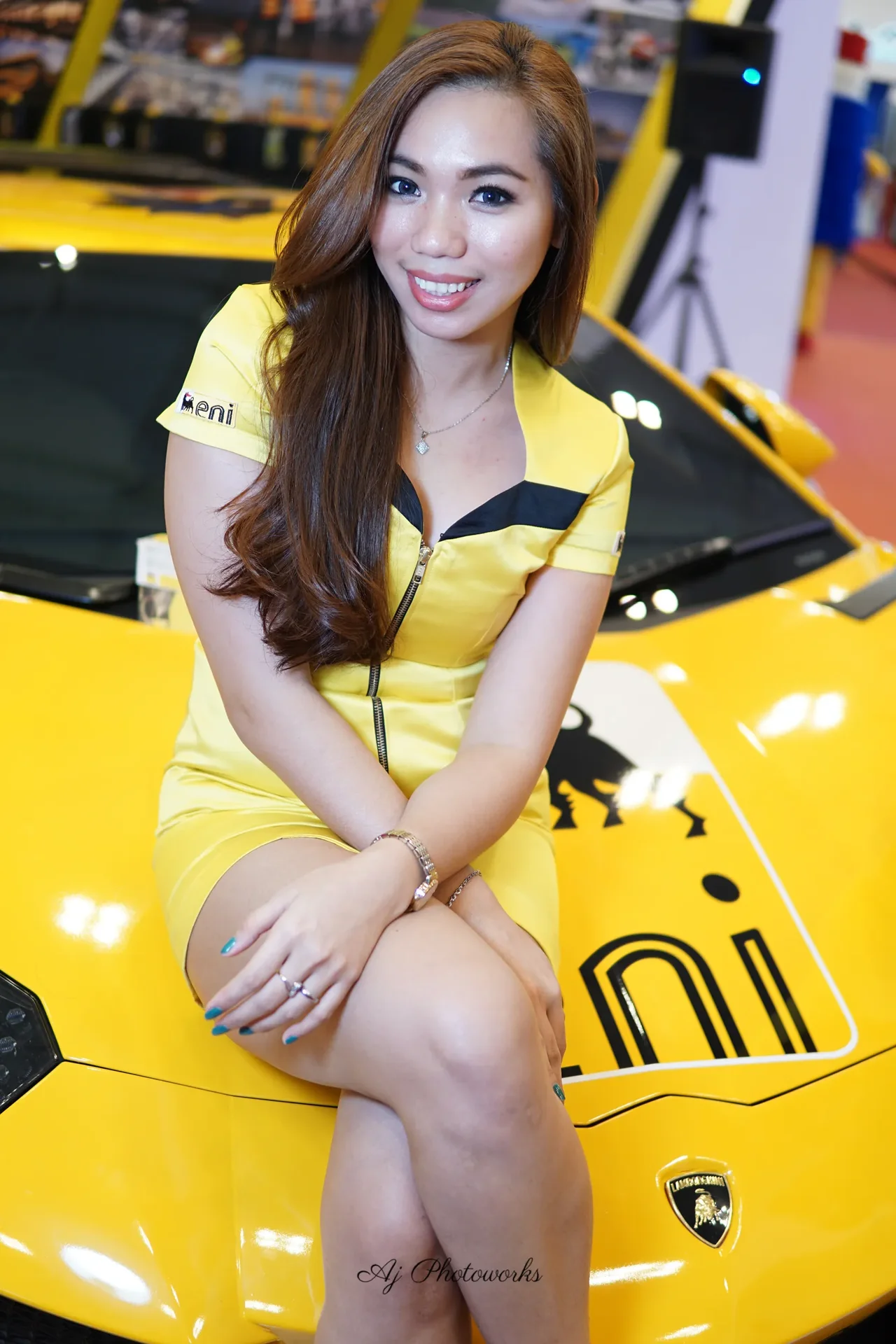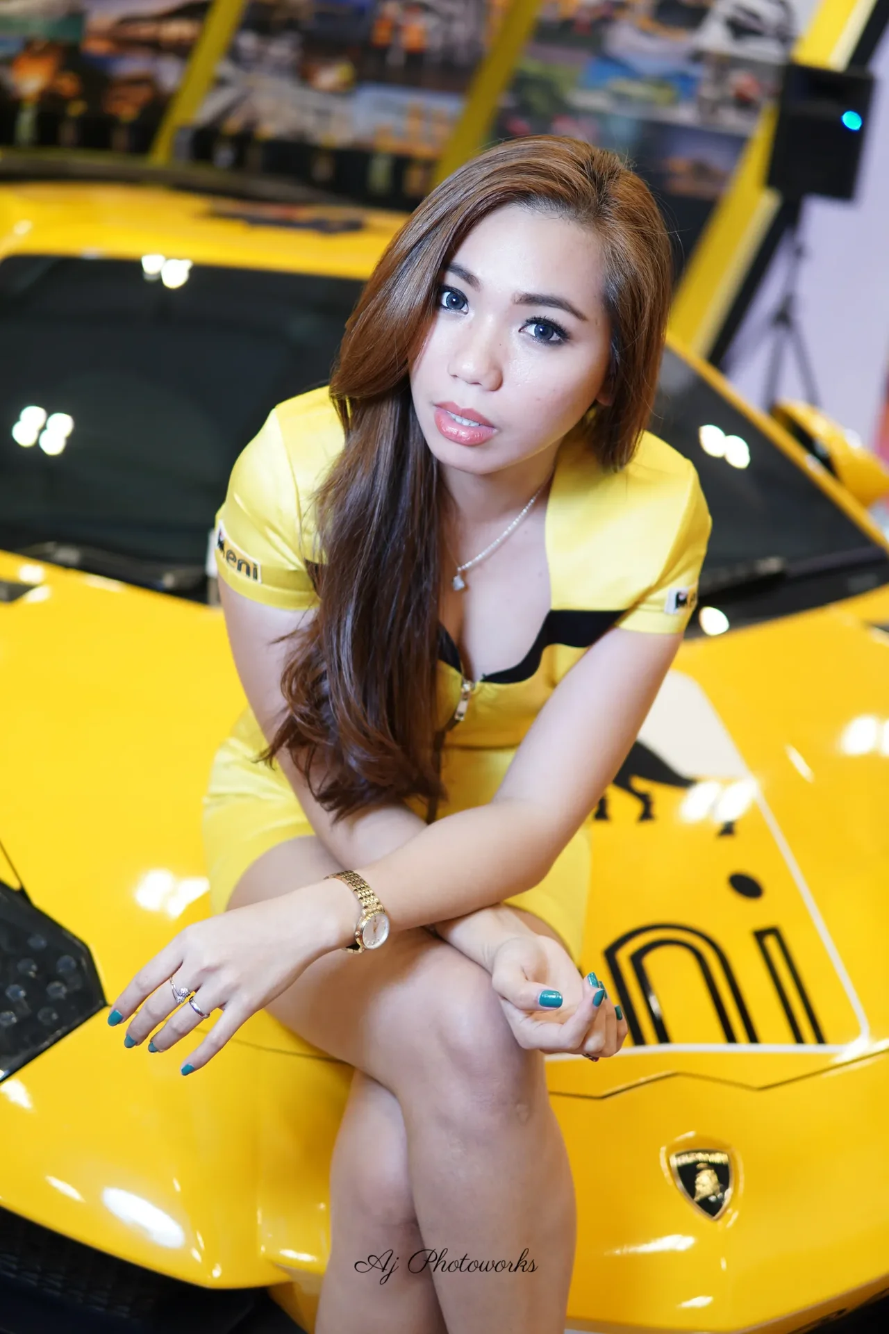 A model in a vibrant neon yellow latex dress with black trim poses with crossed legs, showcasing turquoise nails and a gold watch, seated beside a luxury Lamborghini with its emblem visible.