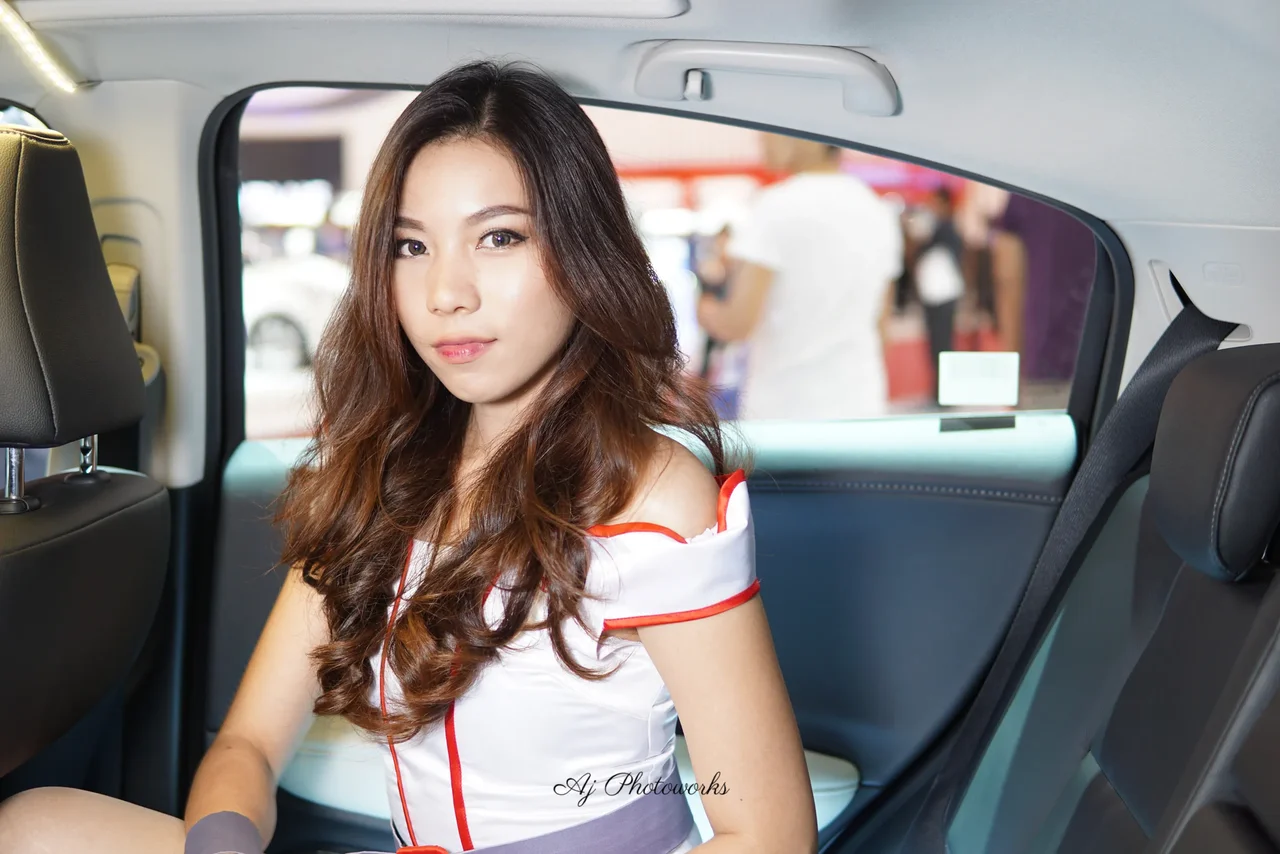 A model poses elegantly inside a car, highlighting a striking fashion outfit against a vibrant backdrop.