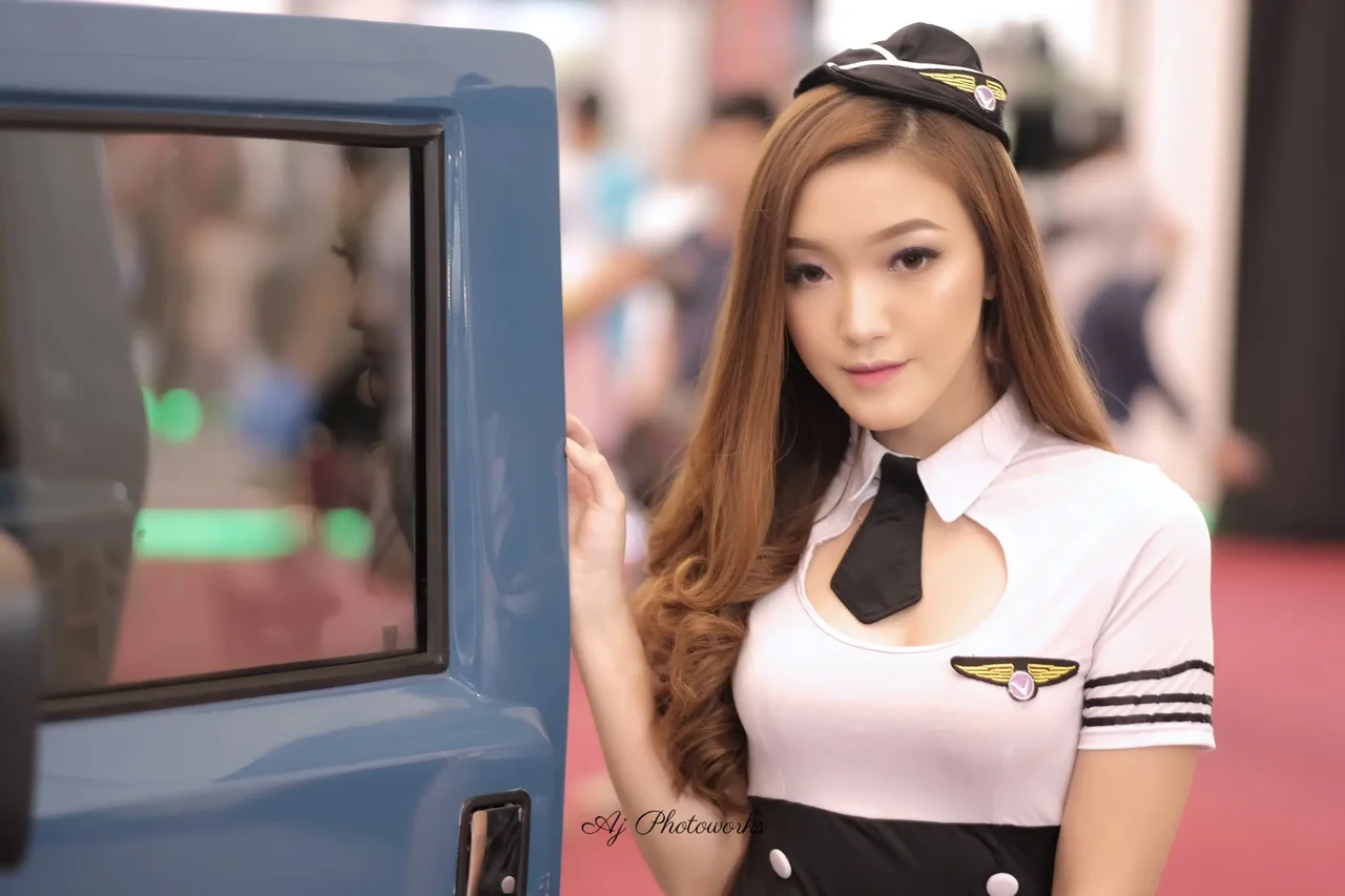 Flight attendant in costume interacts with a Mitsubishi car display at a bustling auto expo.