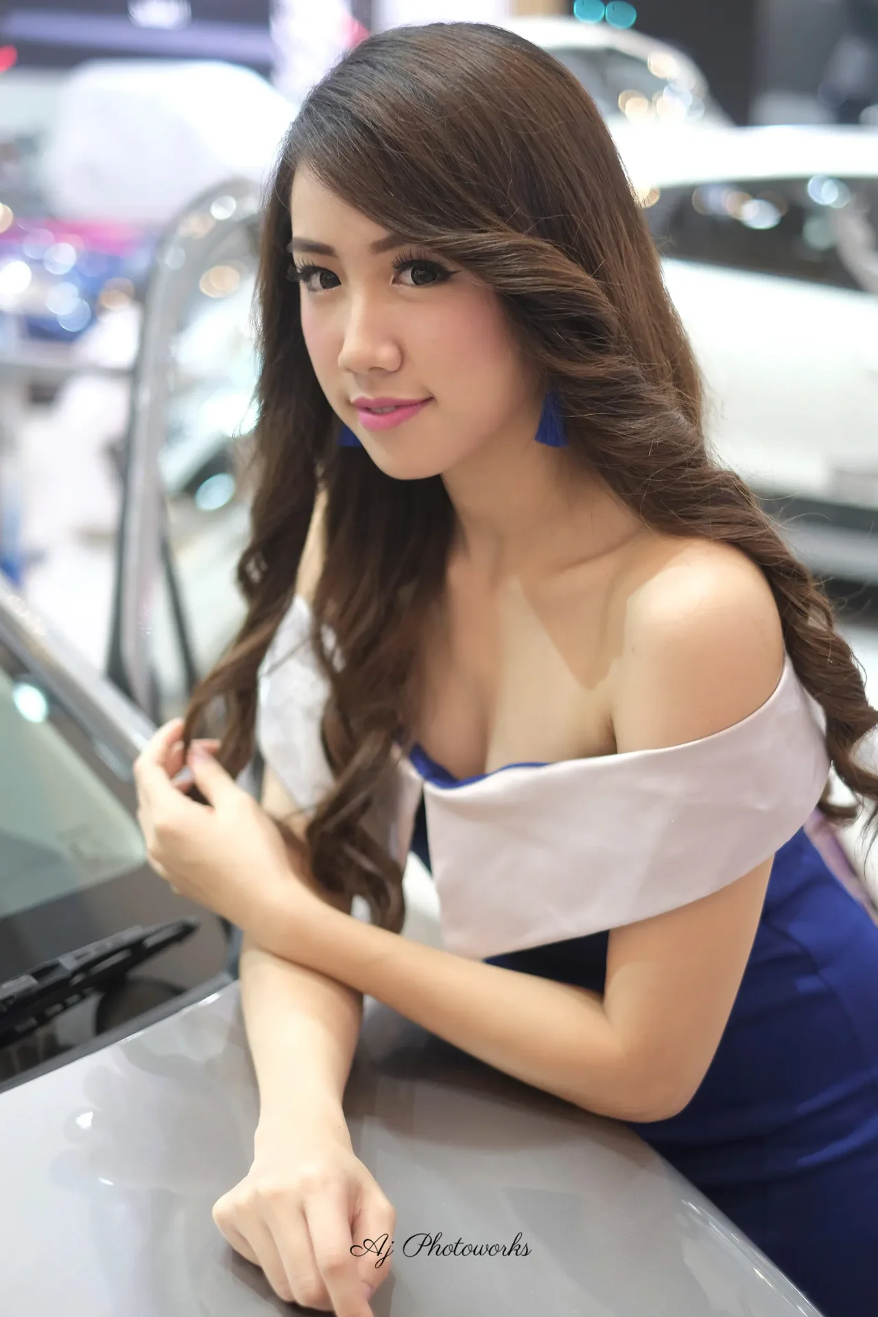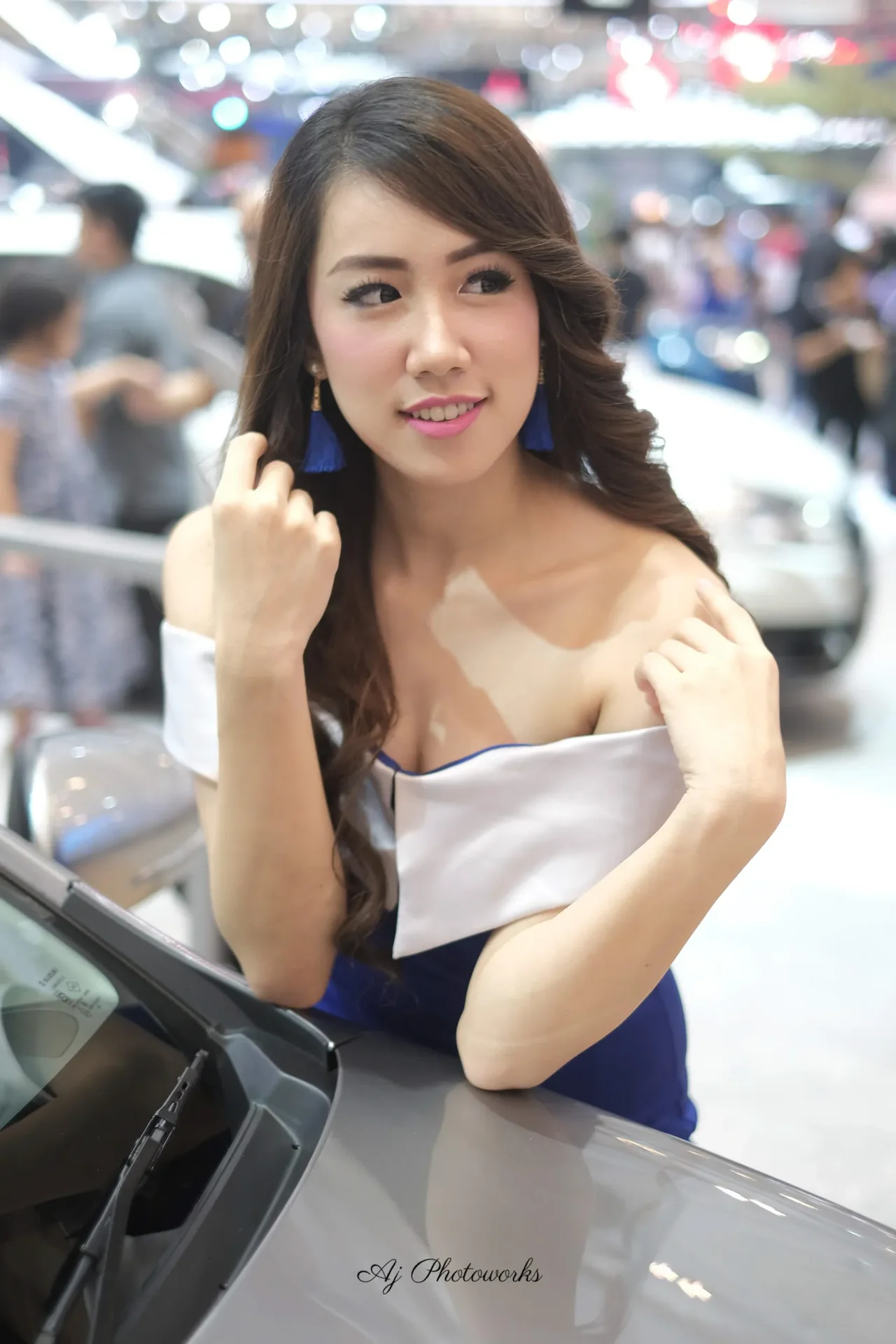 A striking blend of elegance and modernity, capturing fashion at a car exhibition.