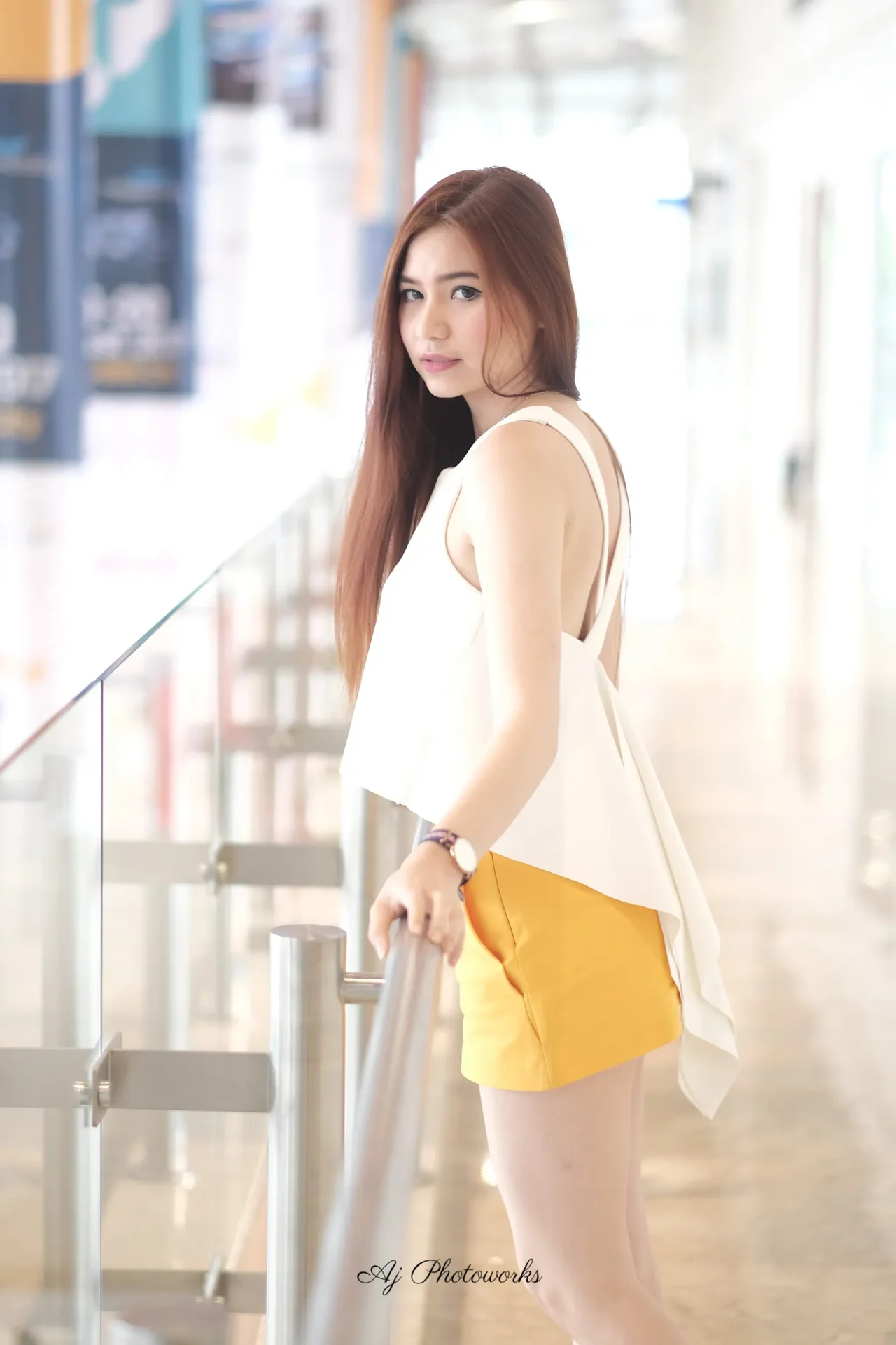 A vibrant fashion statement meets modern sophistication in an airy terminal setting.