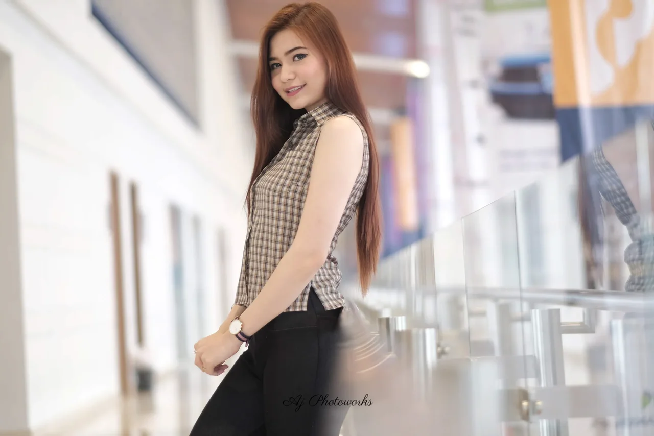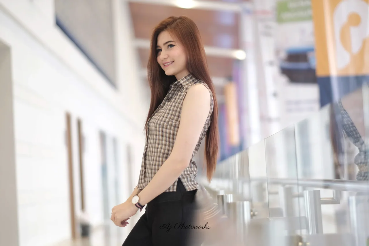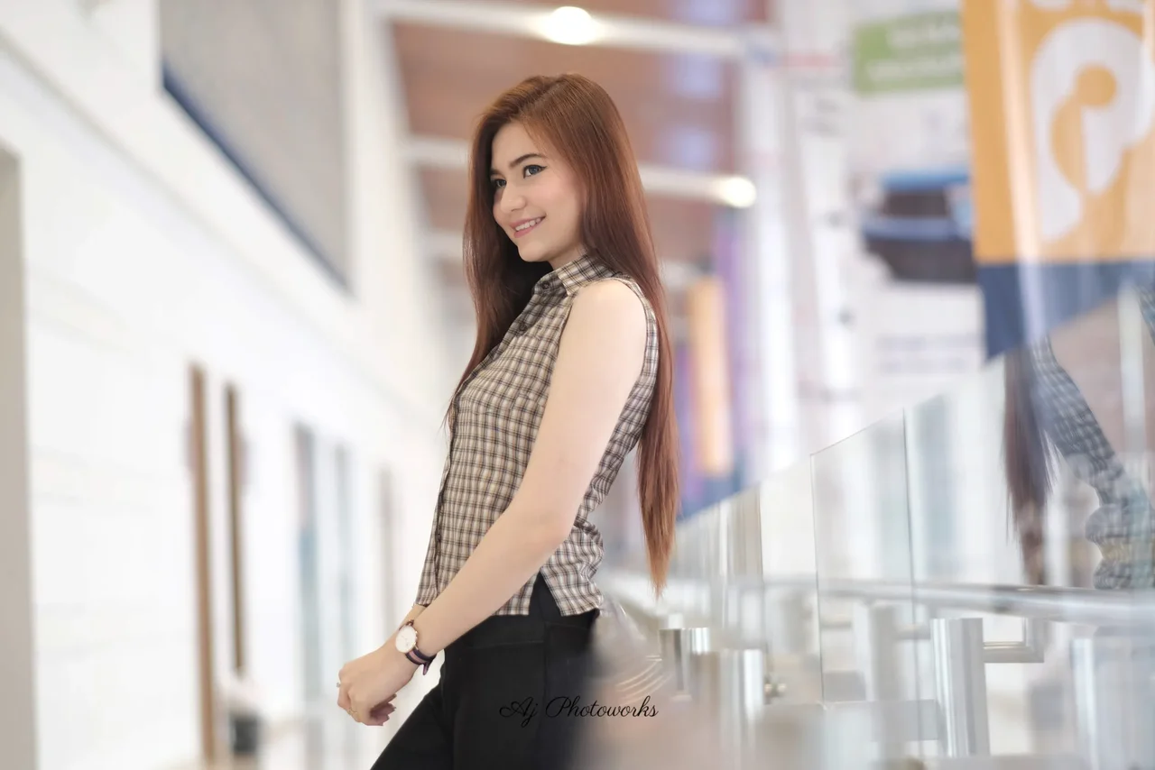 A poised woman in a sleeveless plaid shirt and black pants leans against a glass railing in a softly lit indoor corridor, exuding confidence and warmth.