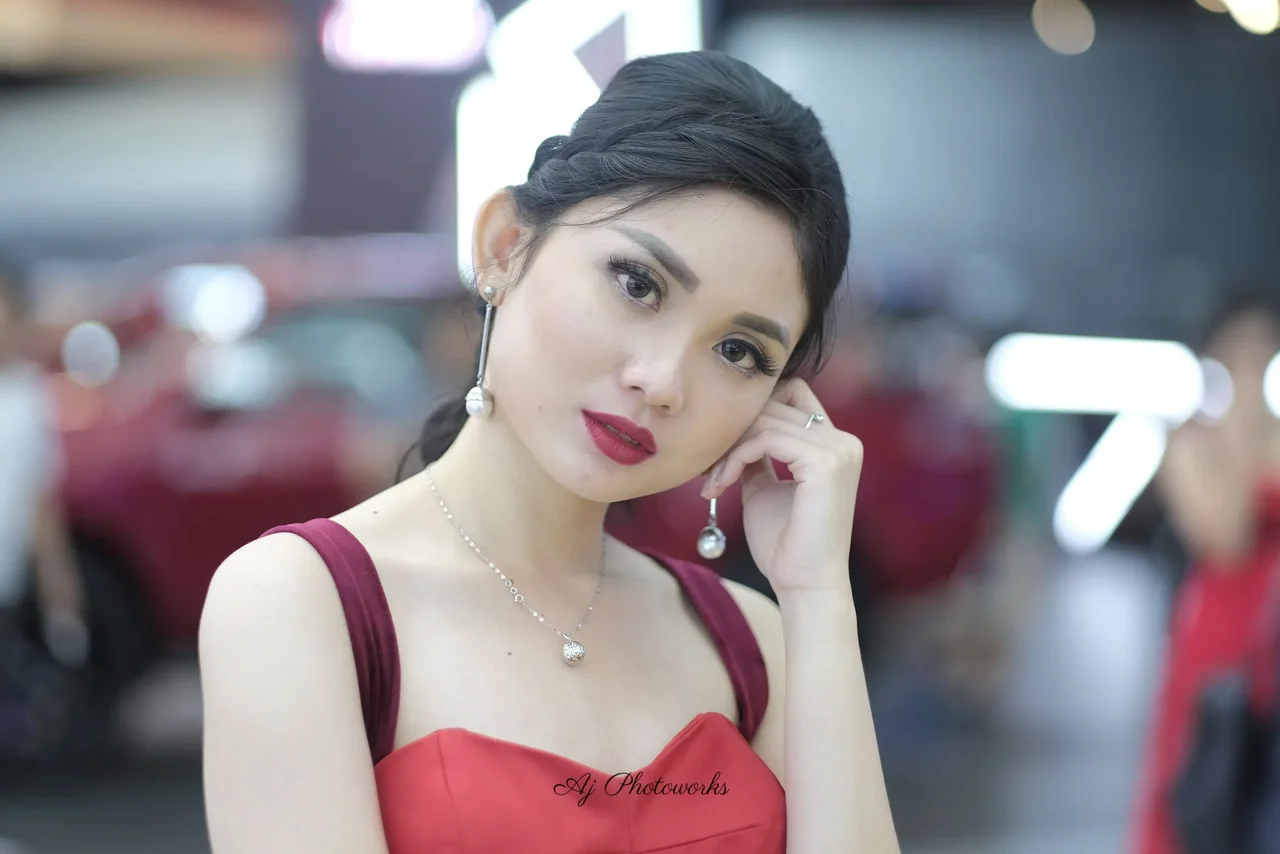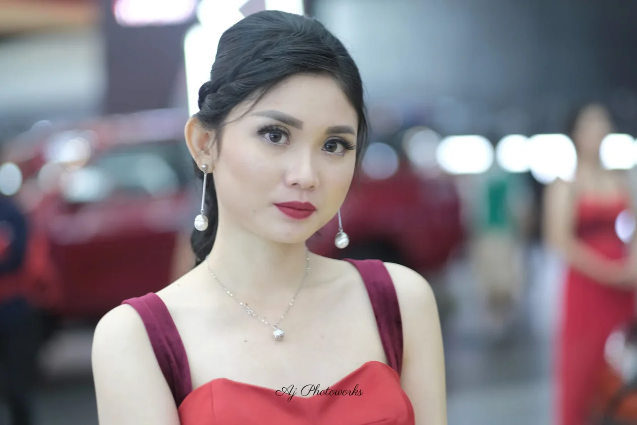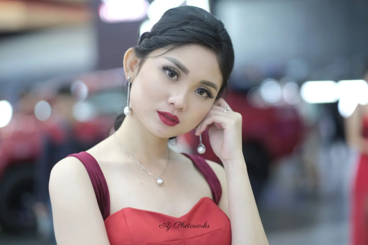A glamorous portrait of a woman at a car show, highlighting her elegant attire and dramatic jewelry.
