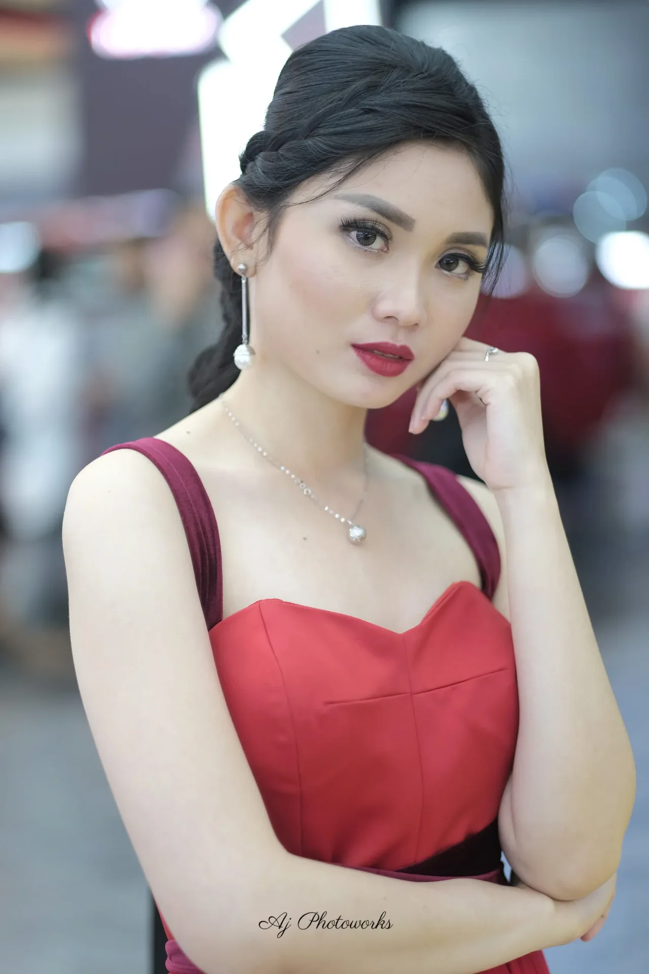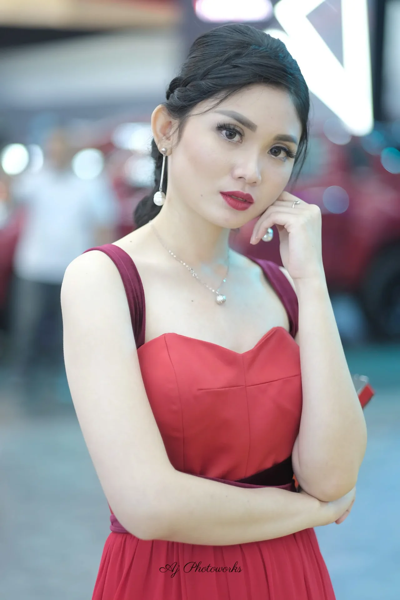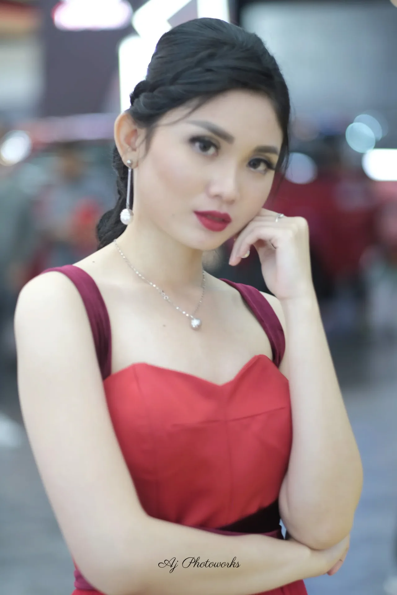 A glamorous portrait of a woman at a car show, highlighting her elegant attire and dramatic jewelry.