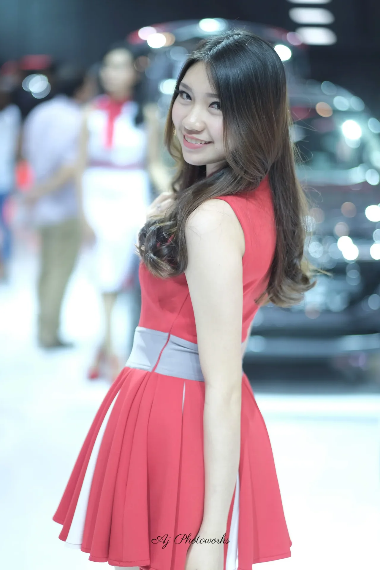 Elegance amidst the hustle and bustle, the vibrant red dress with sharp pleats and contrasting white accents stands out under the dynamic studio lights, capturing a moment of poised confidence in a lively event setting.