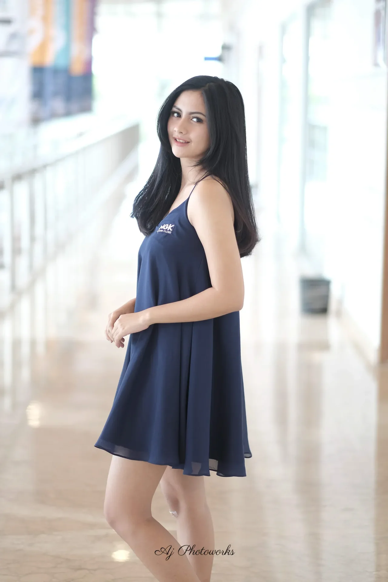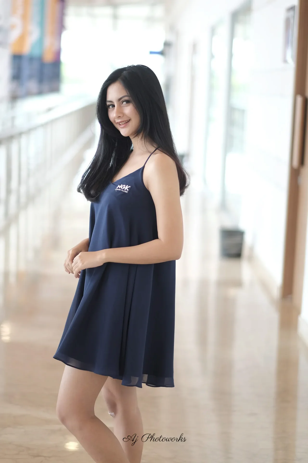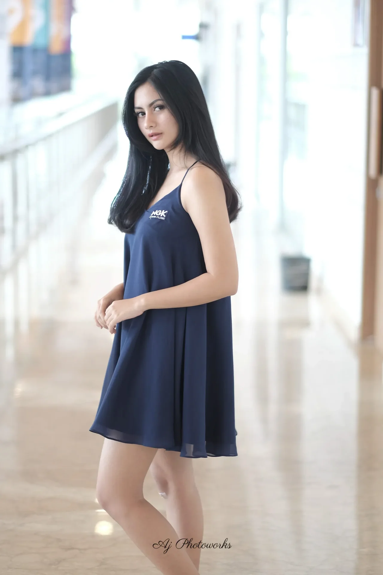 Sunlit confidence in a flowing blue dress, blending modern elegance with professional vibrance.