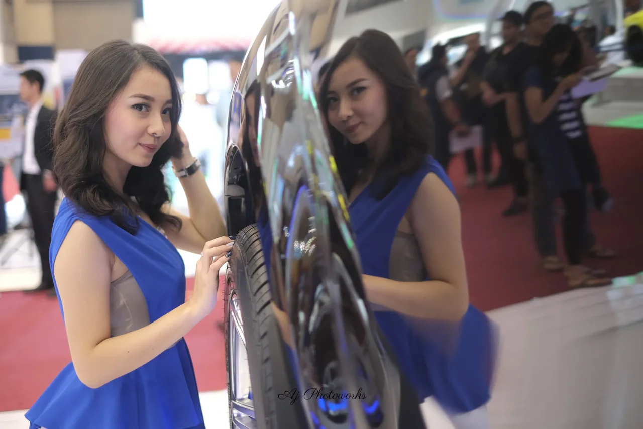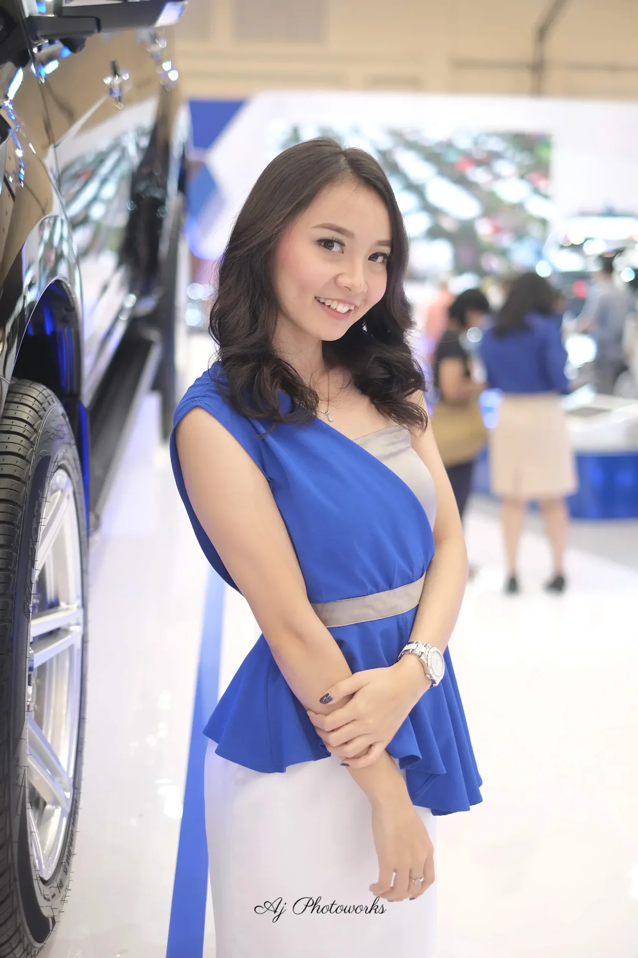 A confident woman in a vibrant blue and white ensemble poses gracefully at an automotive exhibition, blending style with sophistication under bright studio lighting.
